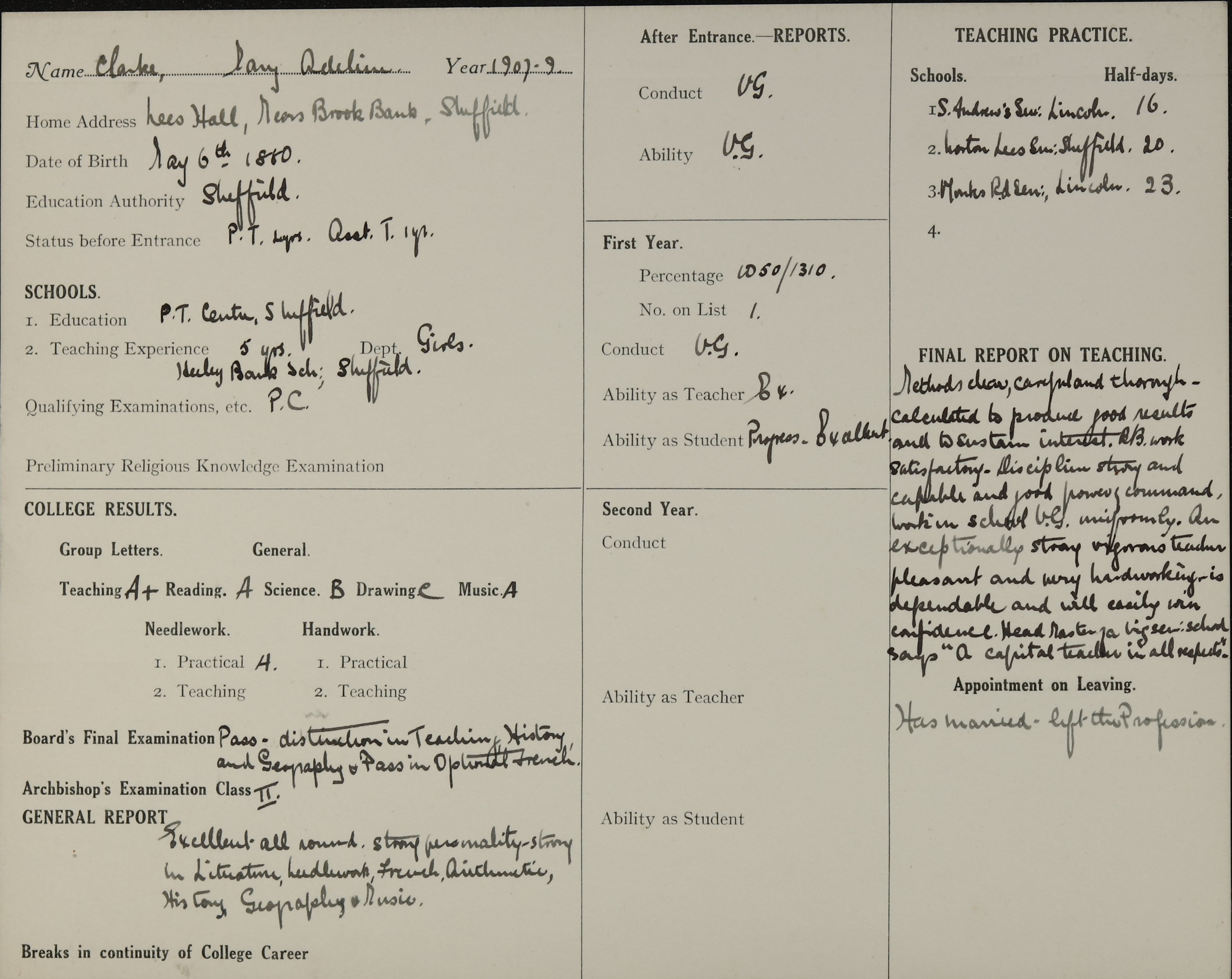 1st Marriage: 5 October 1909, Sheffield
