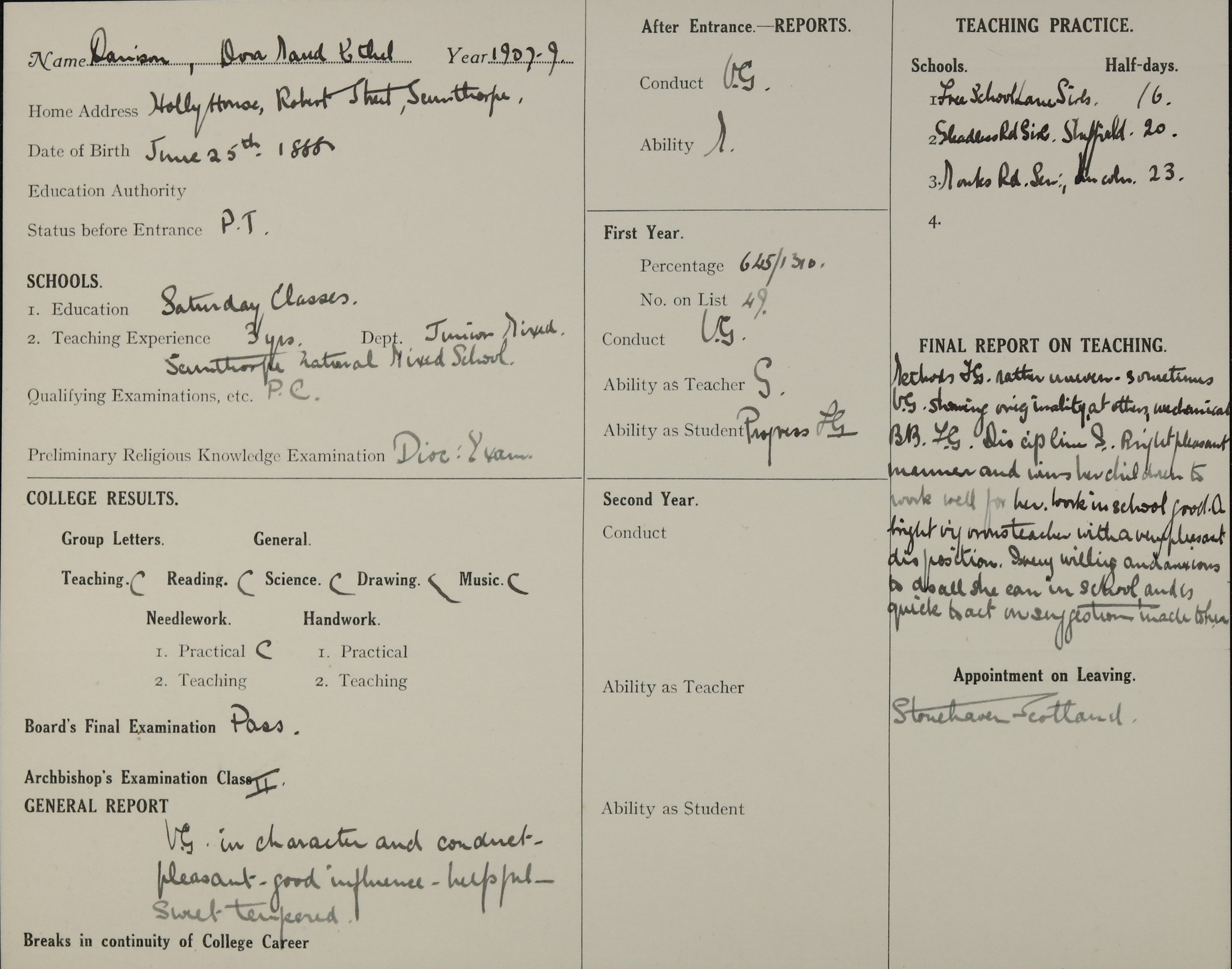She is at Ivy House, 4 Robert Street, Scunthorpe.Her father is listed as ‘Furnace Foreman’. Dora, her mother and siblings (Frank, Eva, Arthur, Alfred and Grosvenor) are unlisted.