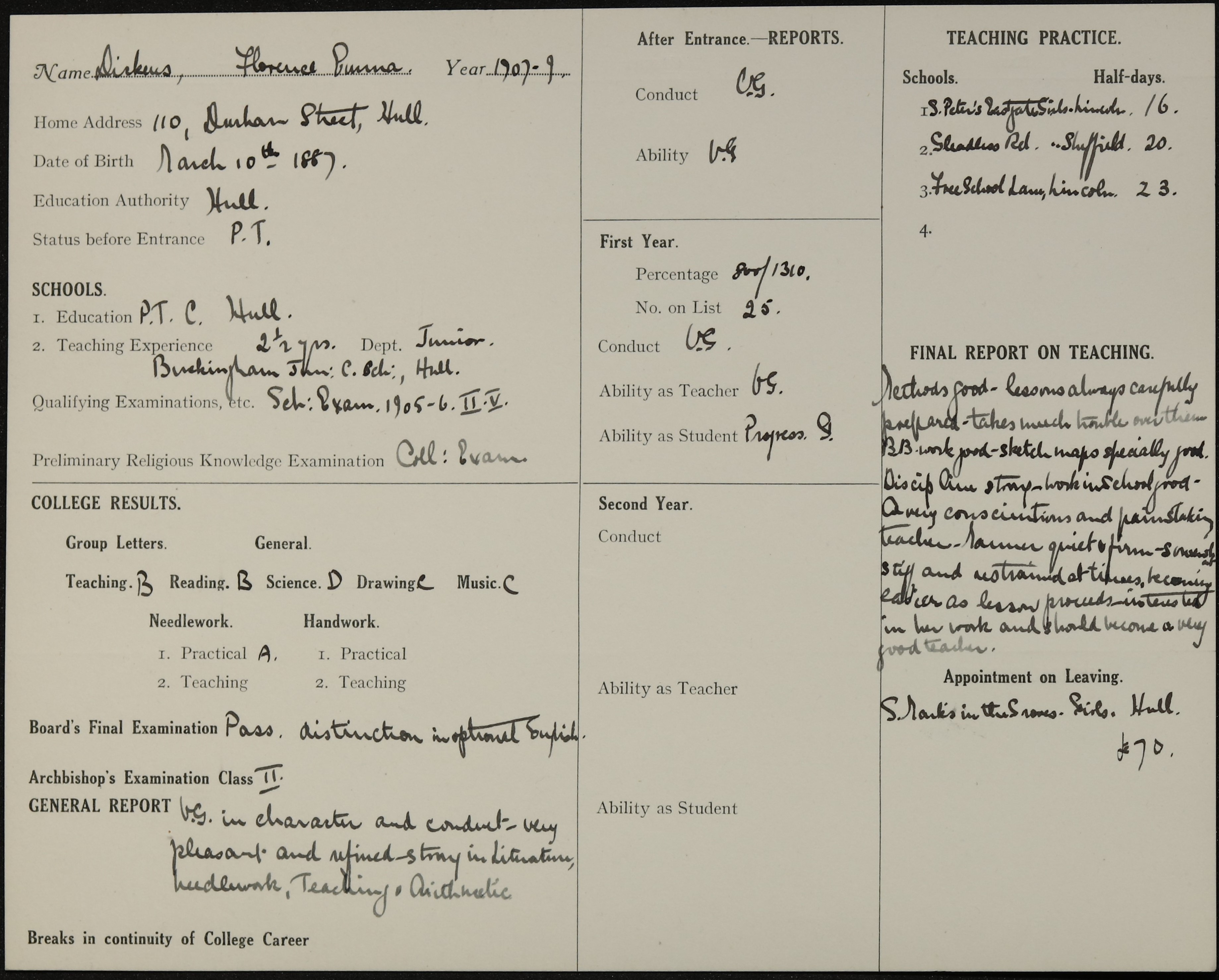She is at 110 Durham Street, Hull. Her father is listed as ‘C E Engineers Inspector of Works’. Her sister, Beatrice, is listed as ‘Shorthand Writer and Typist’. Florence is listed as ‘Certificated School Teacher’. Her mother, her sister (Edith) and nephew Eric Dickens (b. 1904) are unlisted.