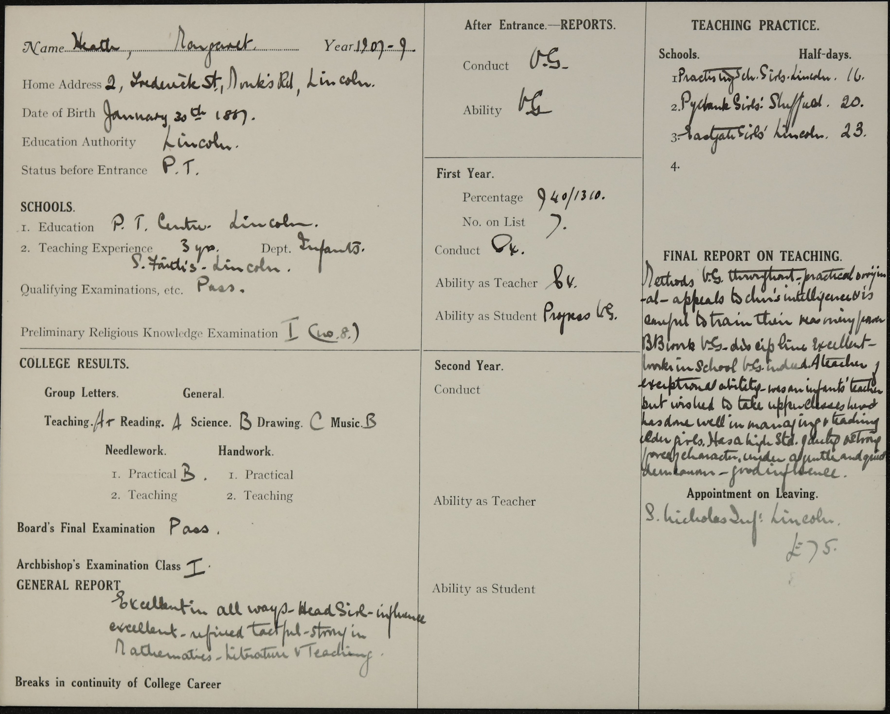 She is at 25 Westcliffe Street, Lincoln. Her mother is an unlisted widow. Her sister, Dorothy, is listed as ‘Milliner Buyer and Saleswoman’. Her sister, Alice, is listed as ‘Shop Assistant Gown Buyer and Saleswoman’. Margaret is listed as ‘Headmistress Local Council School’.