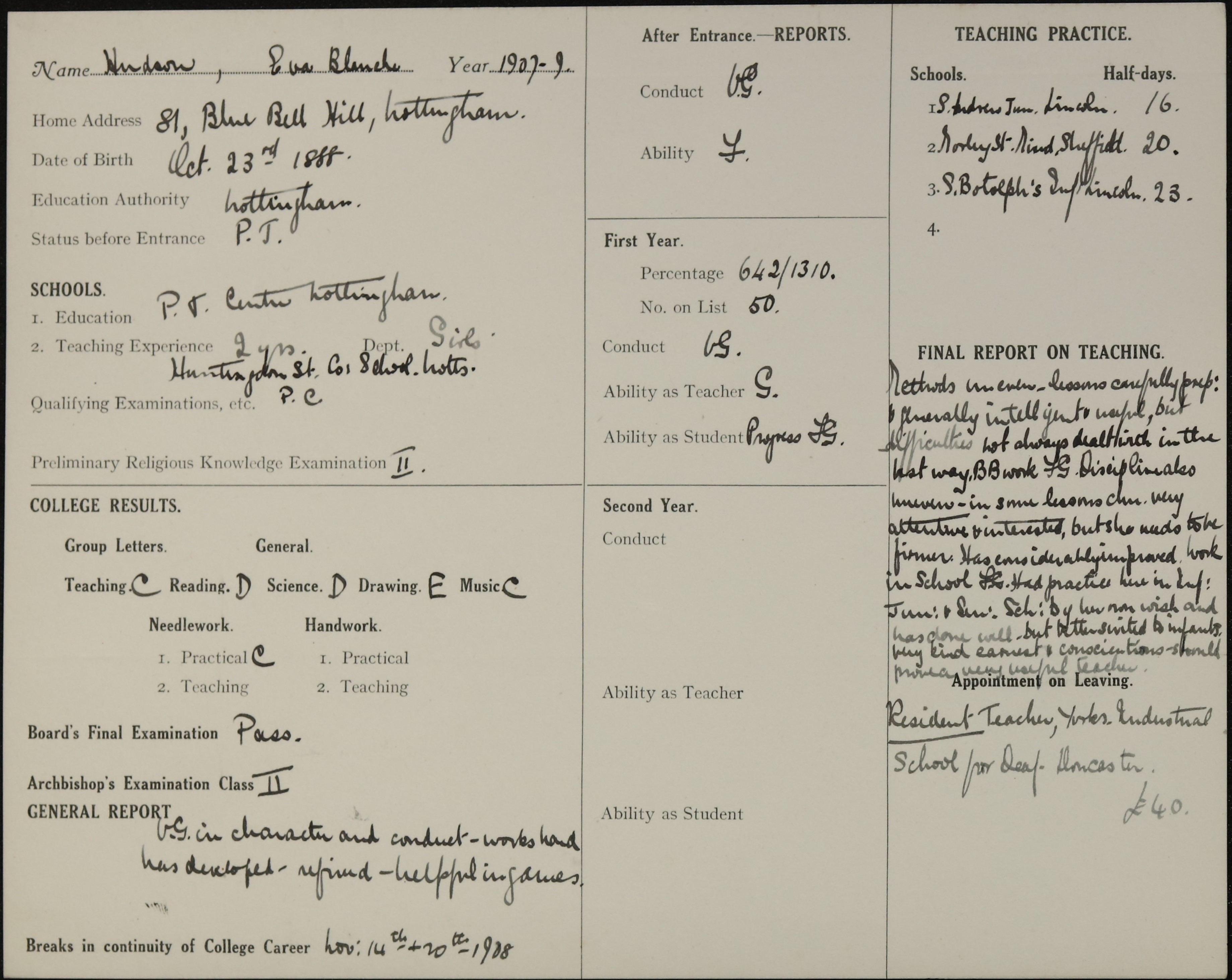 Appointed to Resident Teacher, Institute for the Deaf, Doncaster. £40.