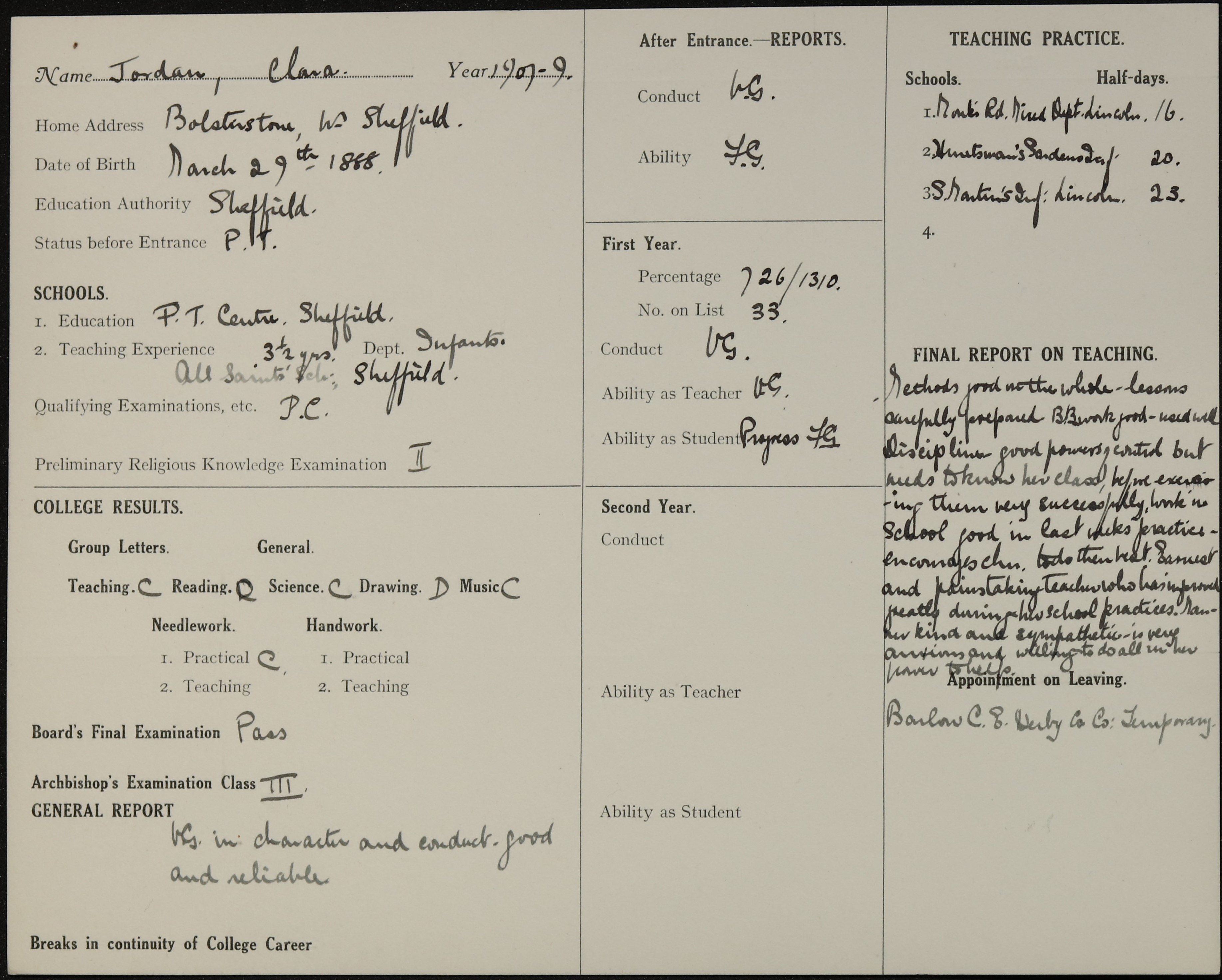 She is at 50 Chesterfield Road, Dronfield. Her husband is listed as ‘Master Butcher’. Clara is listed as ‘School Teacher’.