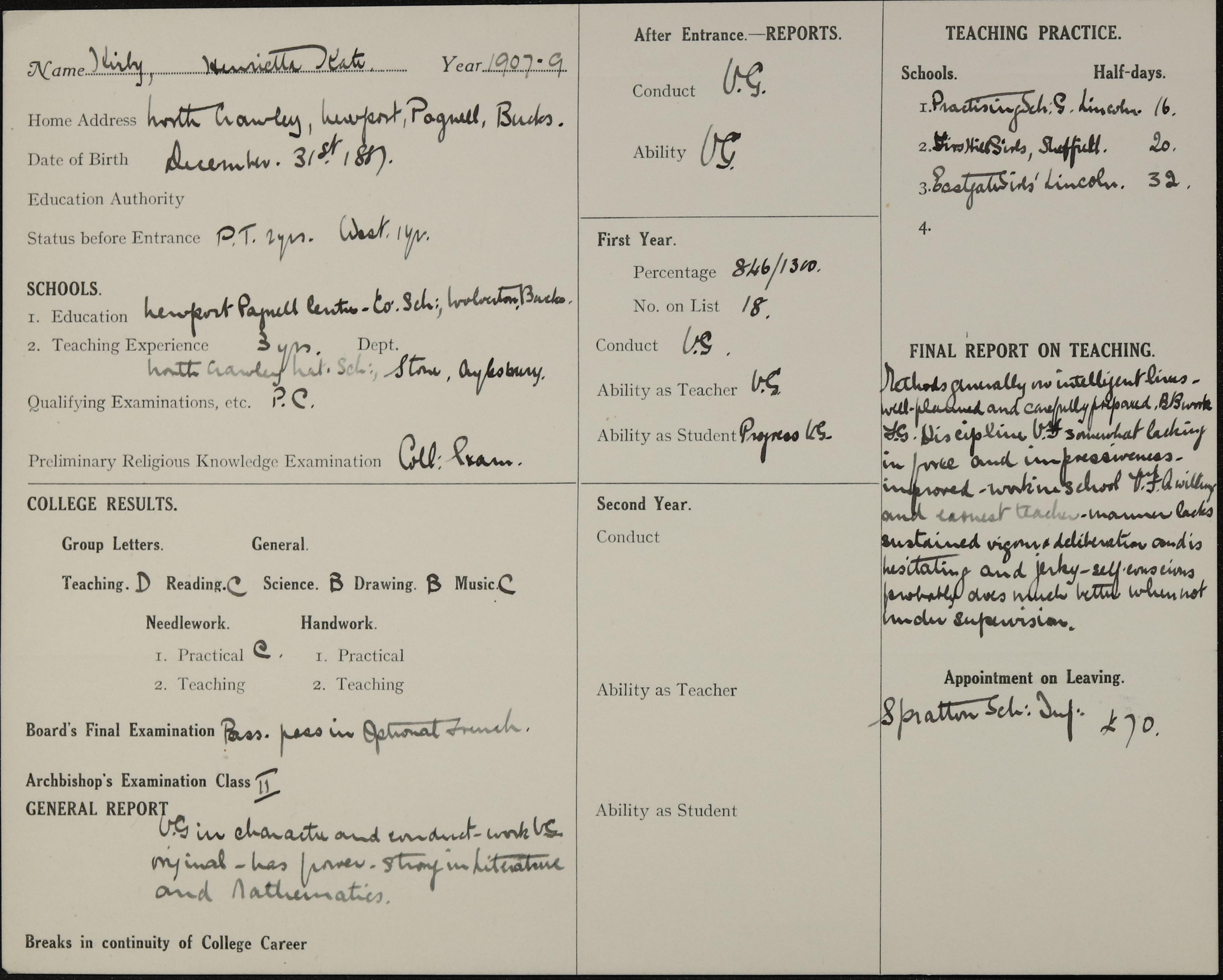 She is at 46 Charles Street, Northampton. Her stepfather is listed as ‘Building Contractor’. Her mother is unlisted. Henrietta is listed as ‘Assistant Teacher’.