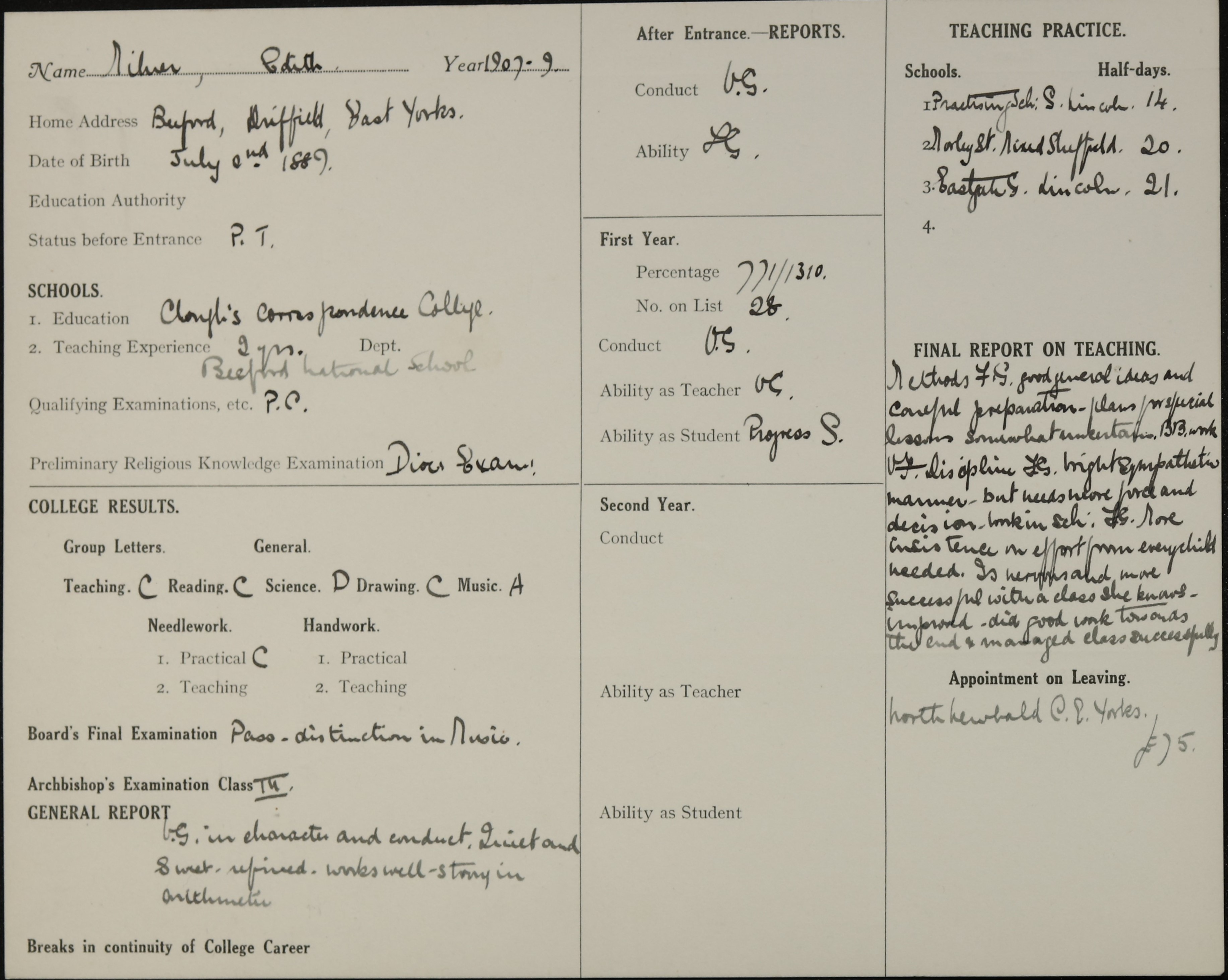 She is at North Newbald, East Yorkshire as a boarder. Amos Moore (b. 1837) is listed as ‘Farmer’. His wife, Annie E Moore (b. 1846), and grandson, Victor B Adams (b. 1905), are unlisted. His daughter, Maud M Moore (b. 1888), is listed as ‘Domestic Help at Home’. Edith is listed as a boarder and ‘Elementary School Teacher’.