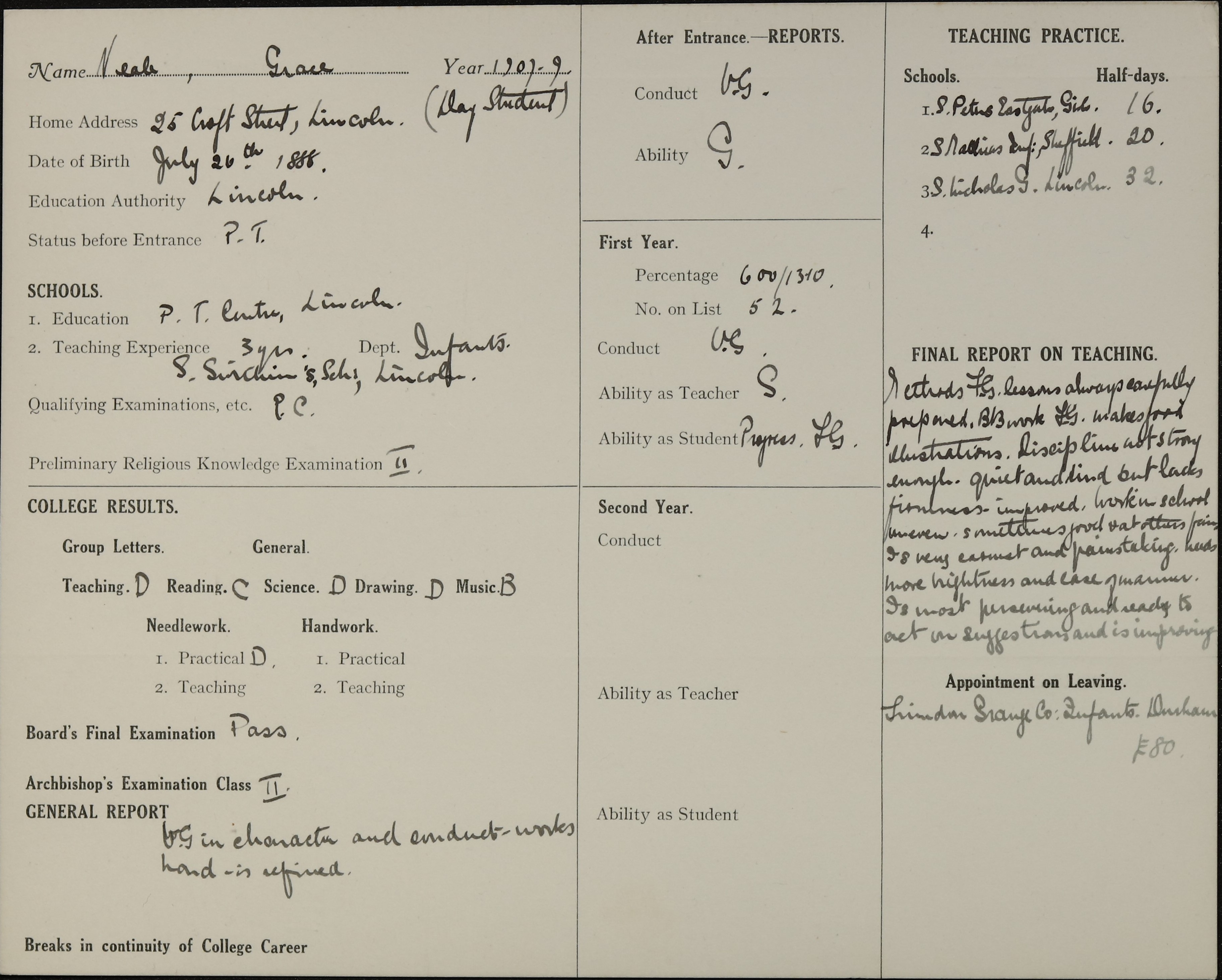 She is at 25 Croft Street, Lincoln. Her father is listed as ‘Foreman Engine Fitter’. Her brother, Arthur, is listed as ‘Pupil Teacher’. Her brother, Horace, is listed as ‘Junior Clerk’. Grace and her mother are unlisted.