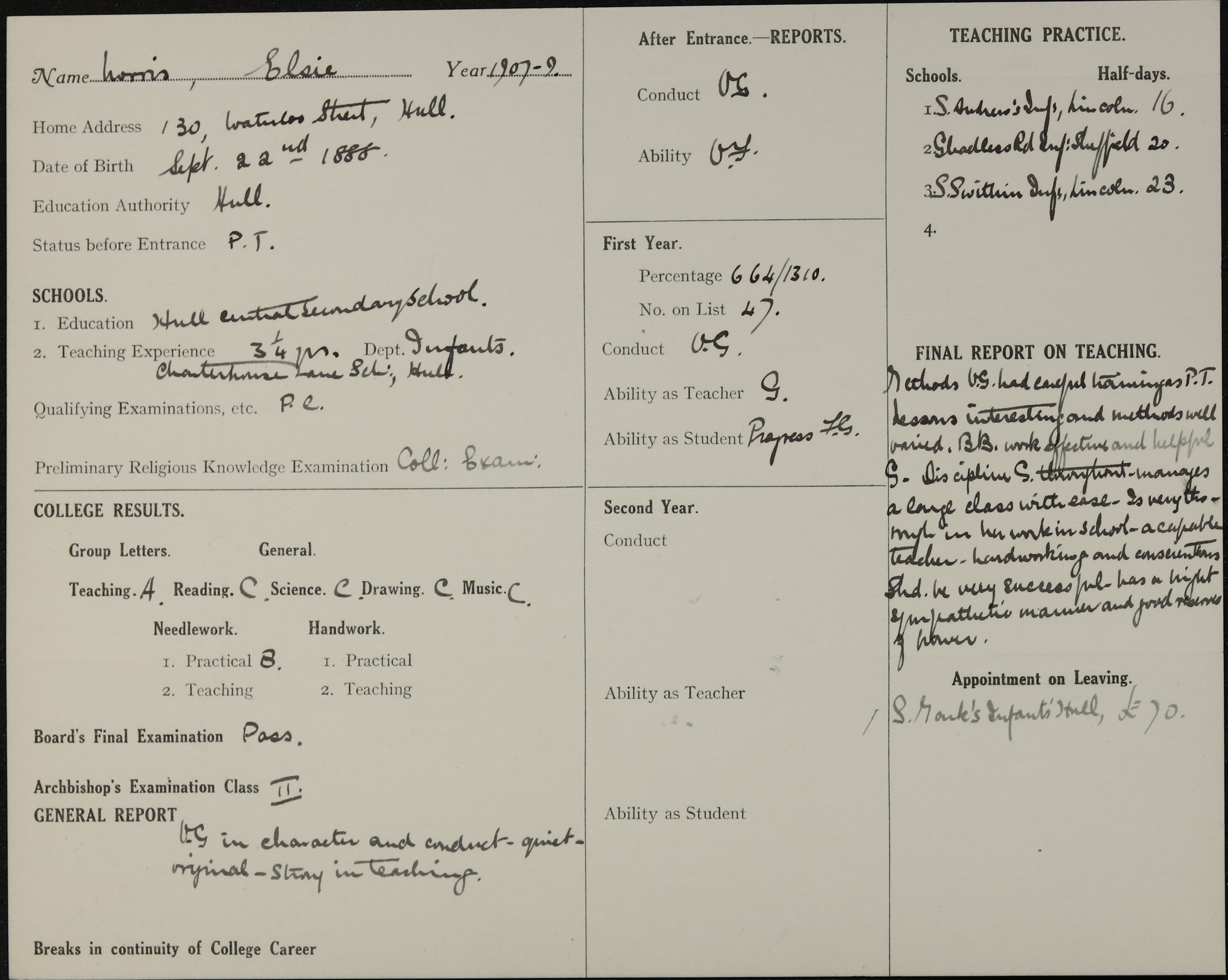 Appointed to St. Mark's Infants', Hull. £70.