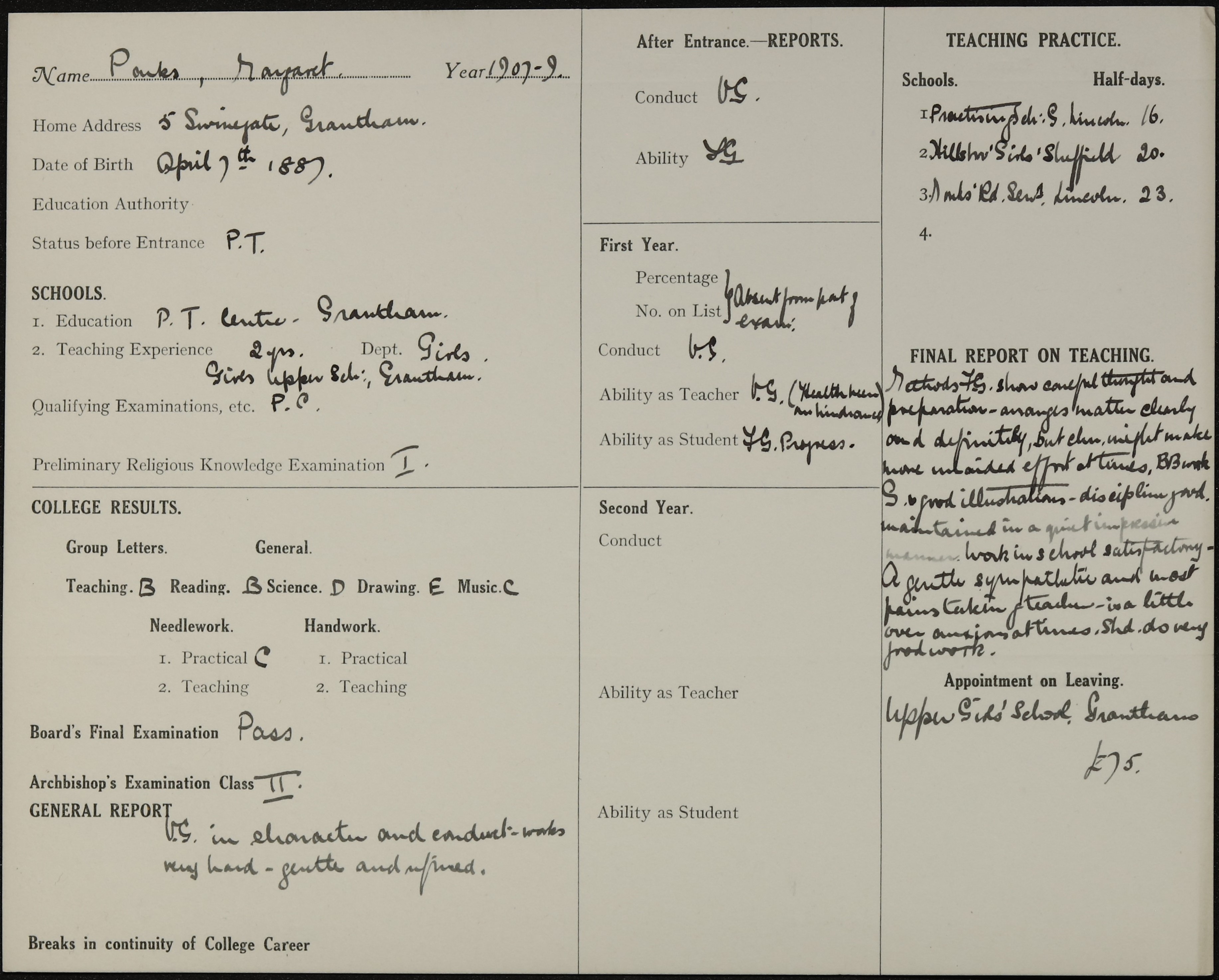 She is at 5 Swinegate, Grantham. Her father is listed as widower and ‘Building Contractor’. Her brother, Ernest, is listed as ‘Superintendent Canvasser’. Her sister, Gertrude, is unlisted. Margaret is listed as ‘Assistant Teacher’. There is a servant, Edith Rebecca Martin (b. 1895).