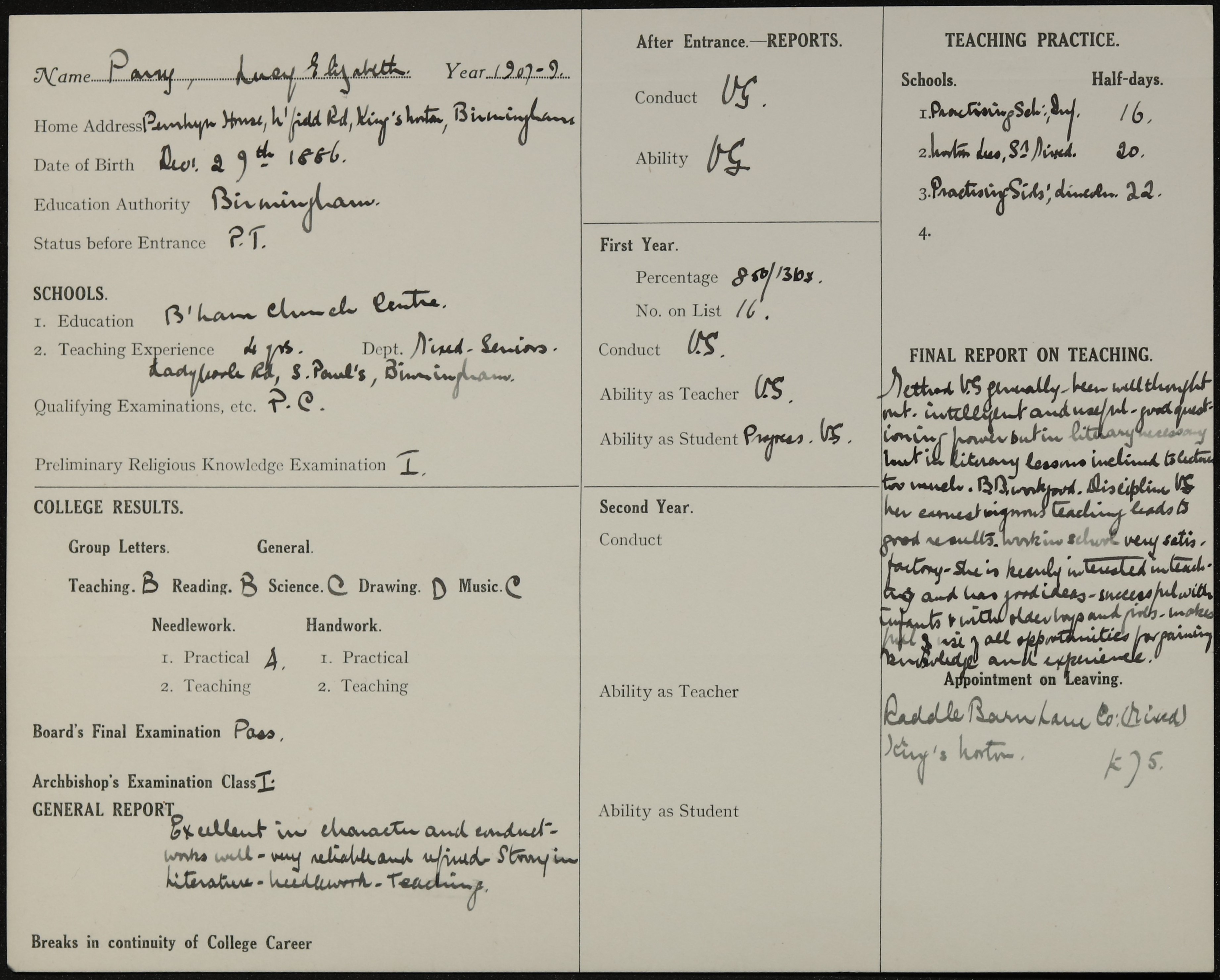 She is at 26 Northfield Road, Kings Norton. Her father is listed as ‘Builder and Contractor’. Her sister, Dora, is listed as ‘Pupil Teacher’. Lucy, her mother and siblings (Agnes, Mabel, Jessie and Frederick) are unlisted.