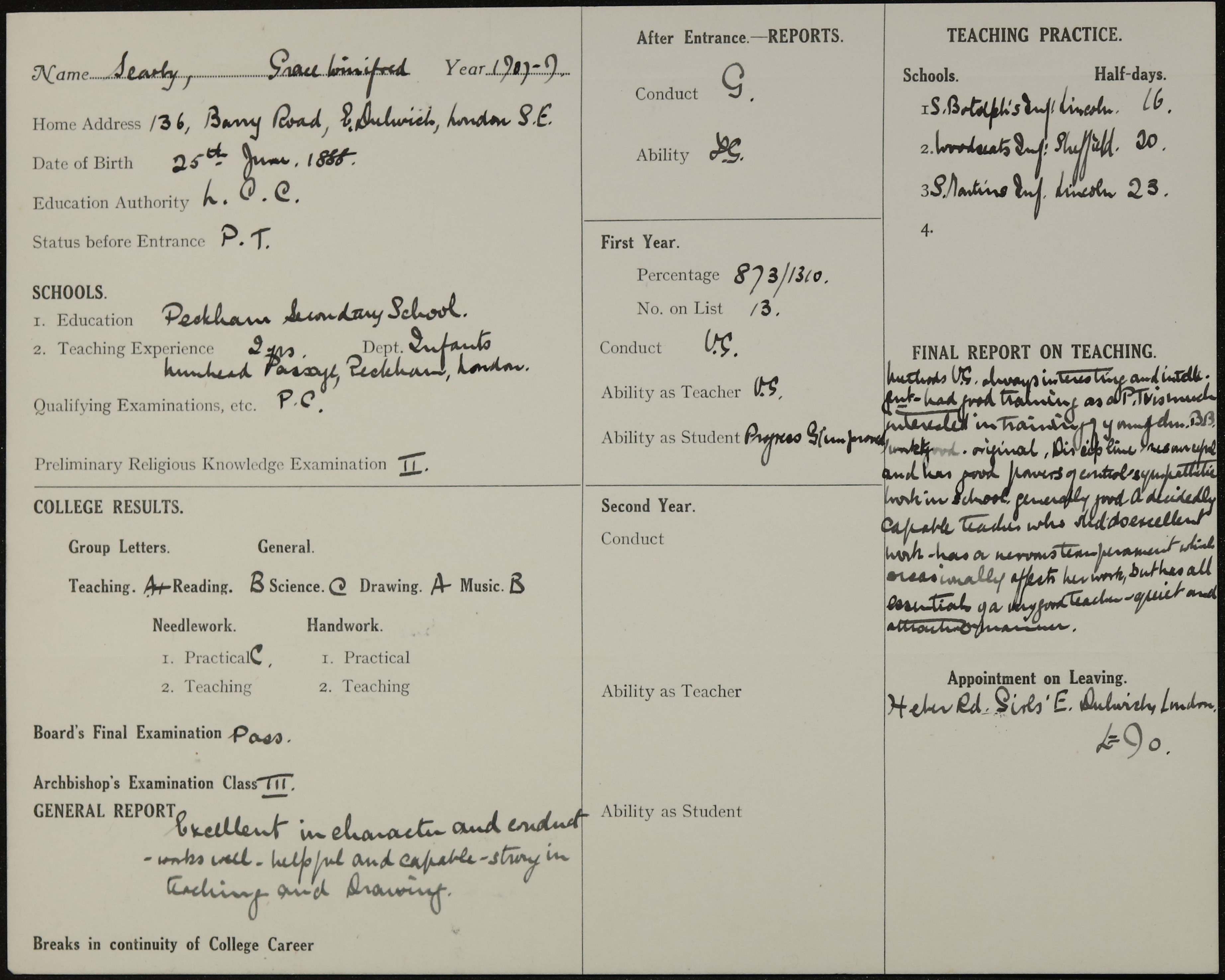 She is at 136 Barry Road, Camberwell, London. Her father is listed as ‘Hosiers Clerk’. Her brother, Harry, is listed as ‘Stock Brokers Clerk’. Her sisters, Violet and Katherine, are listed as ‘Pupil Teacher’. Grace, her mother and sister, Margaret, are unlisted.