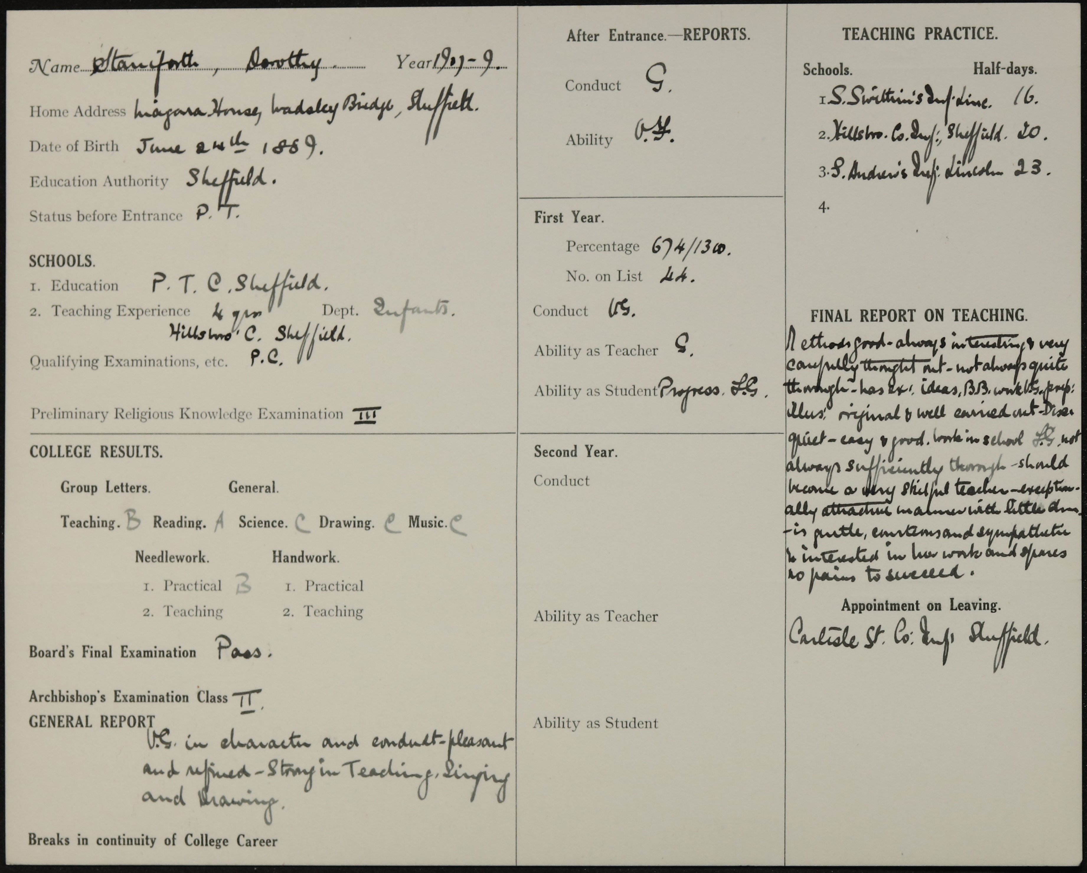 She is at 5 Niagra House, Wadlsey Bridge, Sheffield. Her father is listed as ‘Cashier’s Dukes of Norfolk’s Estates Office’. Her brother, George, is listed as ‘Clerk Duke of Norfolk’s Estates Office’. Her mother and siblings (Margaret, William and John) are unlisted. Dorothy is listed as ‘Certificated Elementary Teacher’.