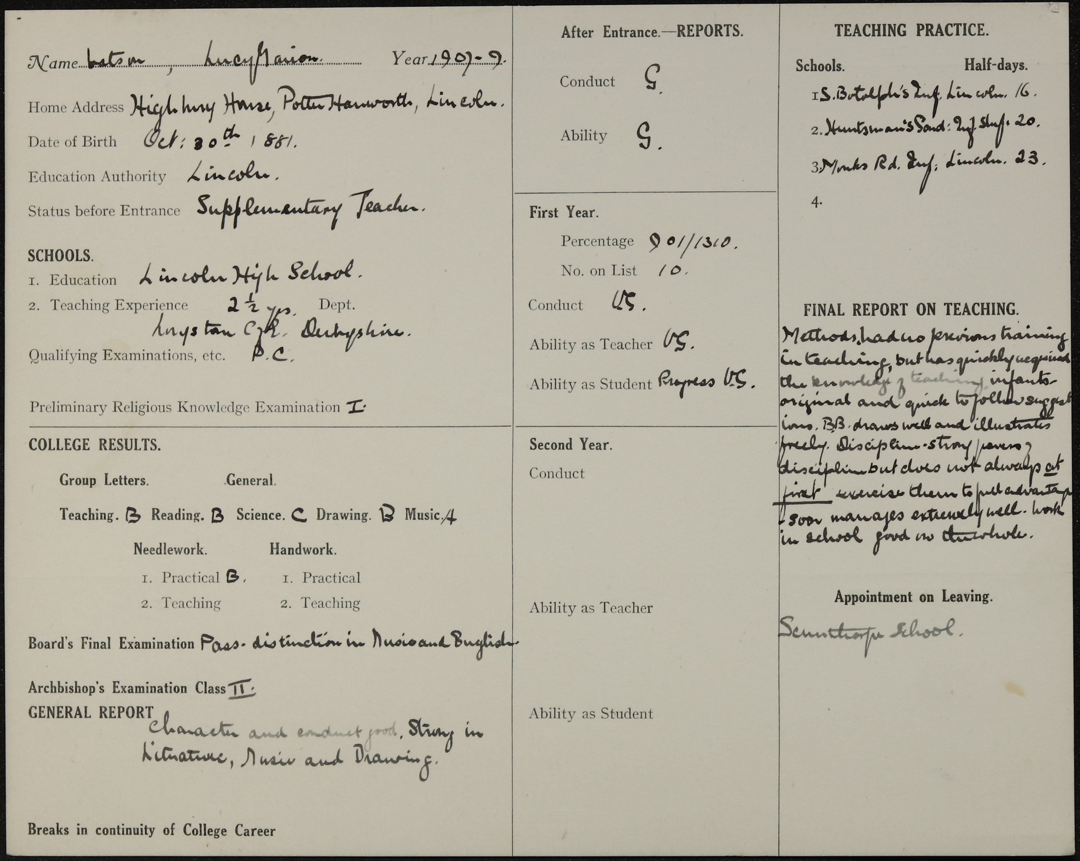 She is at 39 Lessar Avenue, Clapham as a boarder. John James Grindlay (b. 1868) is listed as ‘House Furnisher Manager’. His wife, Florence, and daughter, Marjorie, are unlisted. His son, Clifford J Grindlay (b. 1895), is listed as ‘Mechanical Fitter’. His father-in-law, Duncombe Lines (b. 1841), is listed as ‘Fish Salesman’s Clerk’. There is a servant, Rosina Smith (b. 1887). Lucy is listed as a boarder and ‘School Mistress LCC’.
