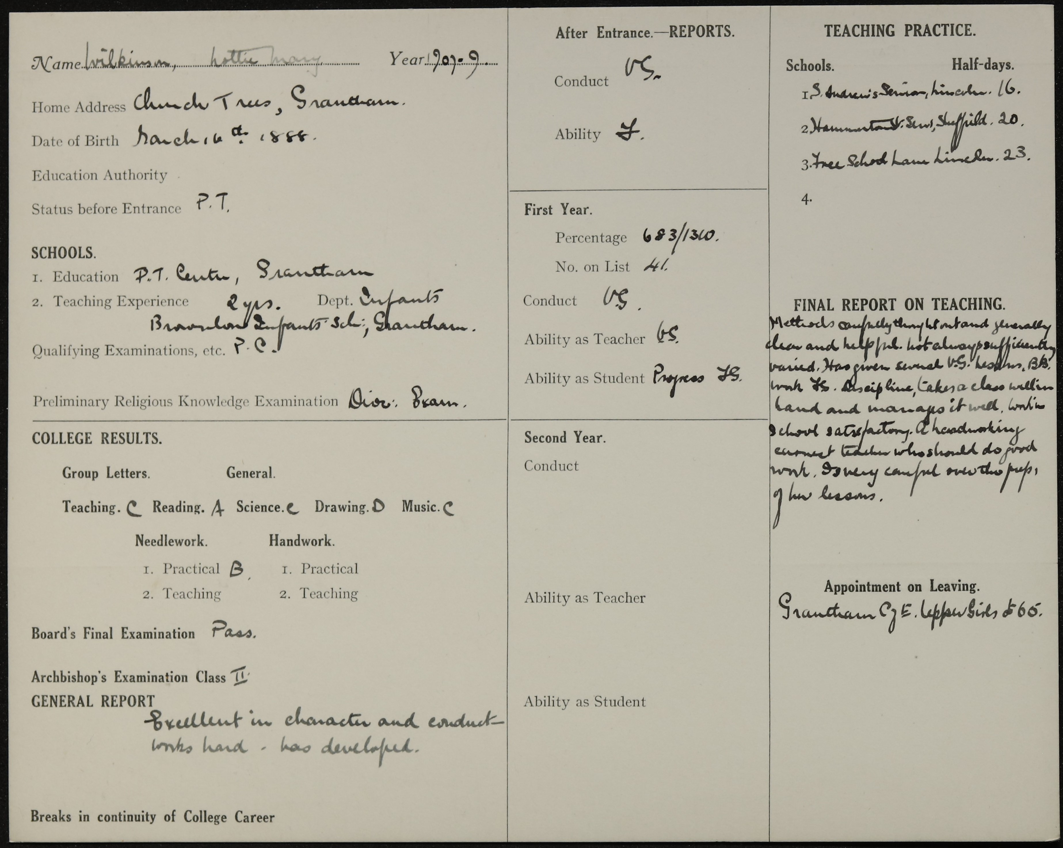 Appointed to Grantham C. of E. Upper Girls'. £65.