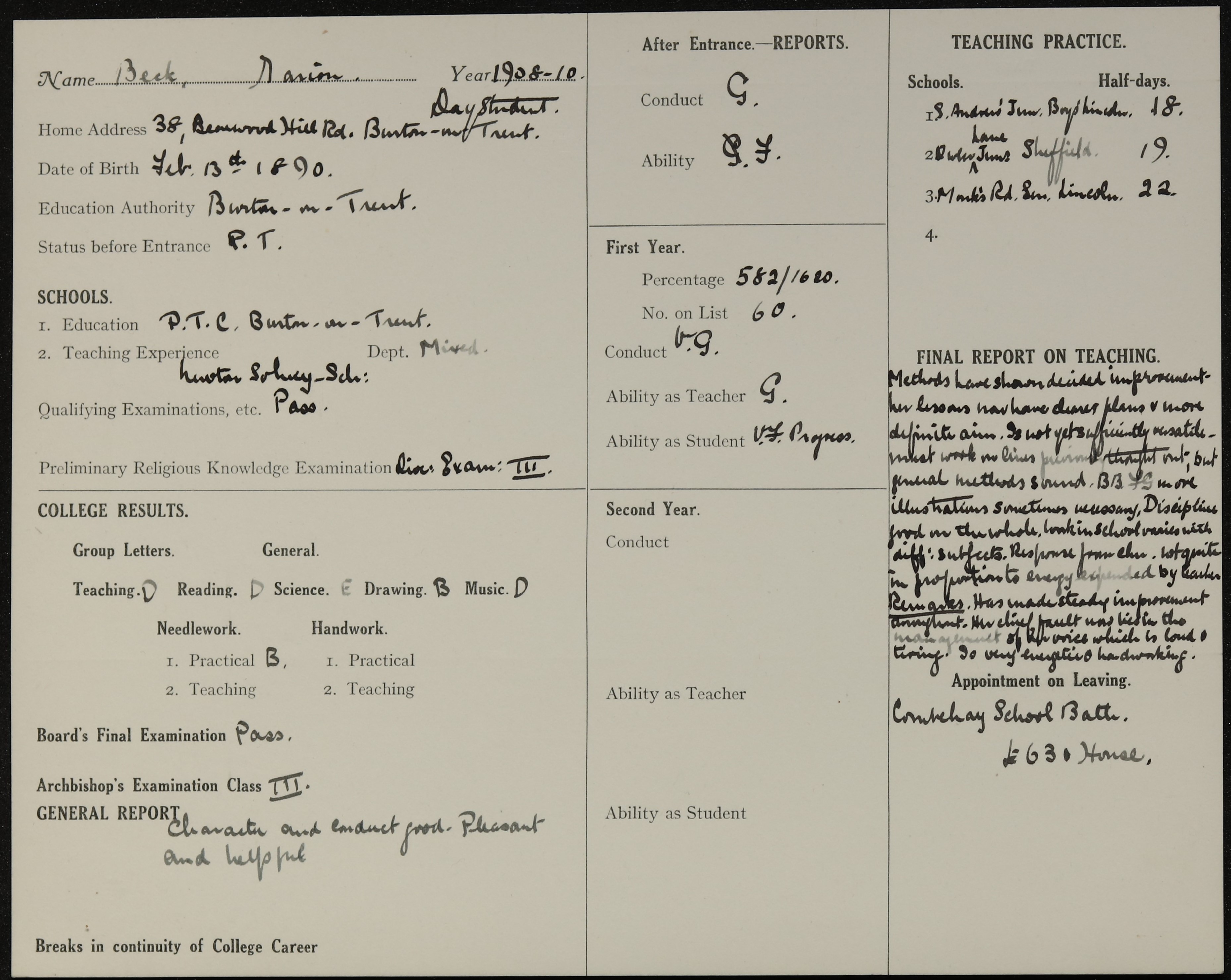 She is at 38 Bearwood Hill Road, Winshill, Burton upon Trent. Her father is listed as ‘Schoolmaster’. Marion and her mother are unlisted.