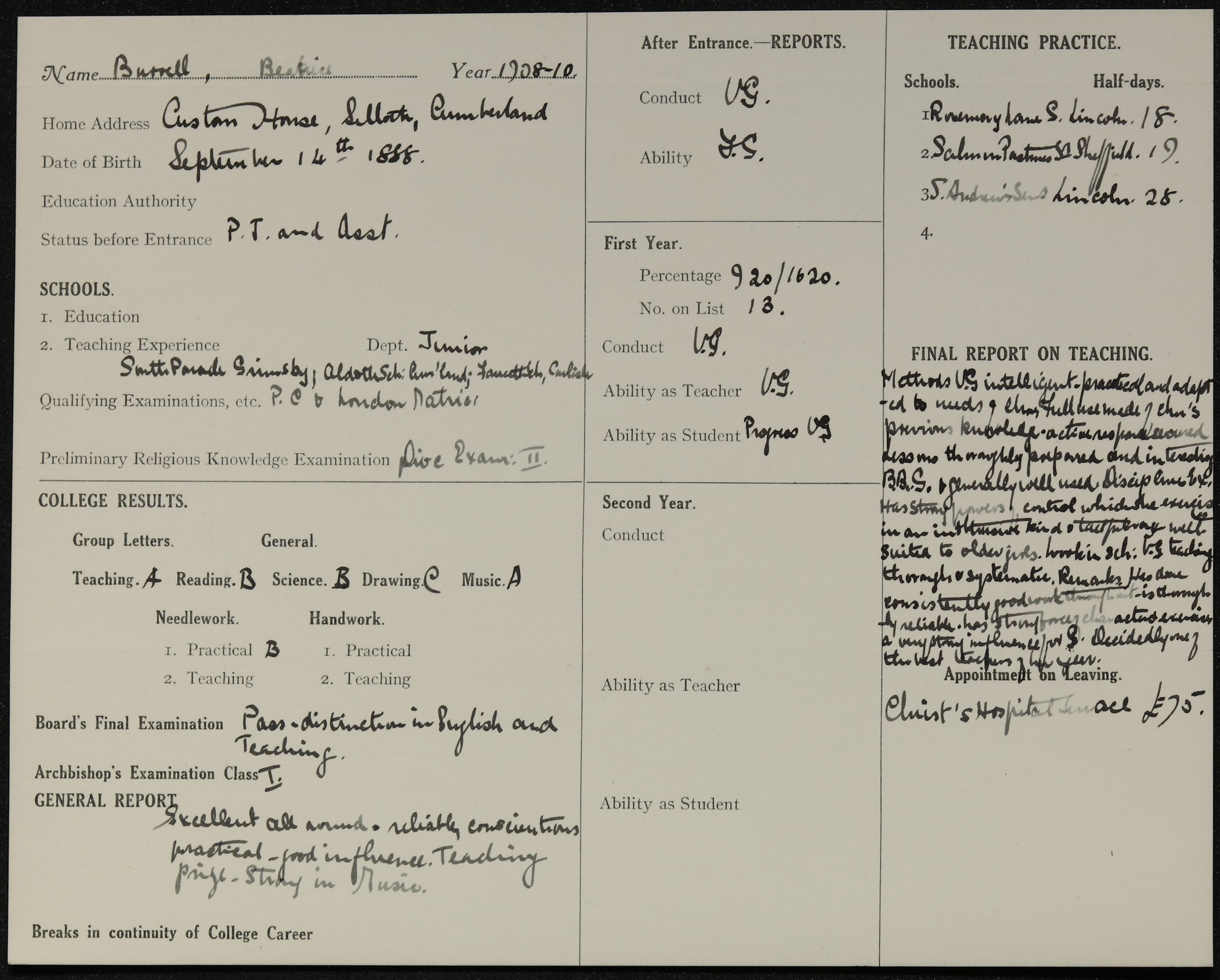 She is at The Schools, Throckenholt, Gedney Hill, East Elloe. Beatrice is listed as ‘Teacher Elementary School’. Ethel M Allister (b. 1882) is listed as ‘Household Duties’. There is a servant, J Isley (b. 1910).