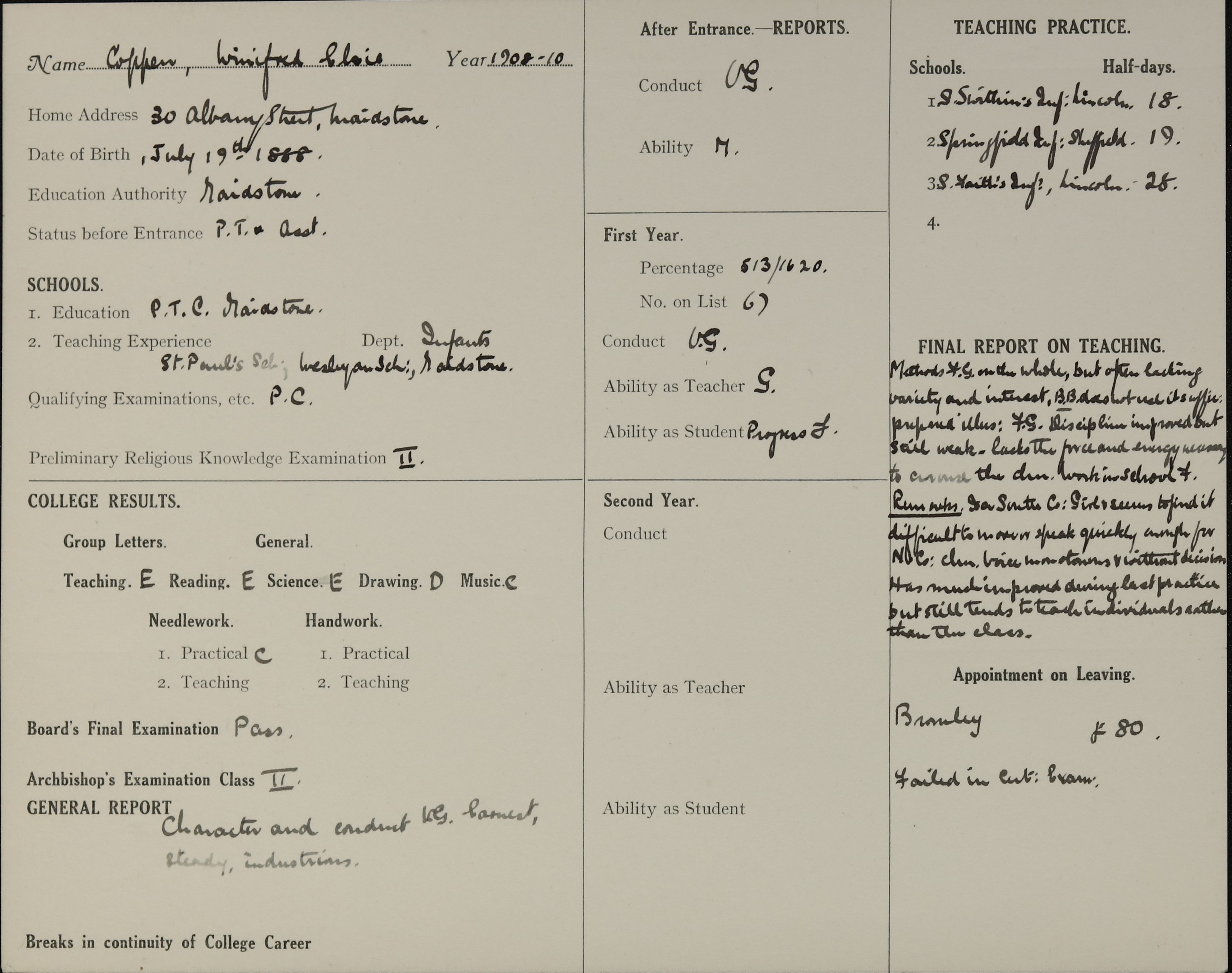 She is at Albany Street, Maidstone. Her father is listed as ‘Wood Joiner’. Winifred, her mother and siblings (Alan and Evangeline) are unlisted.