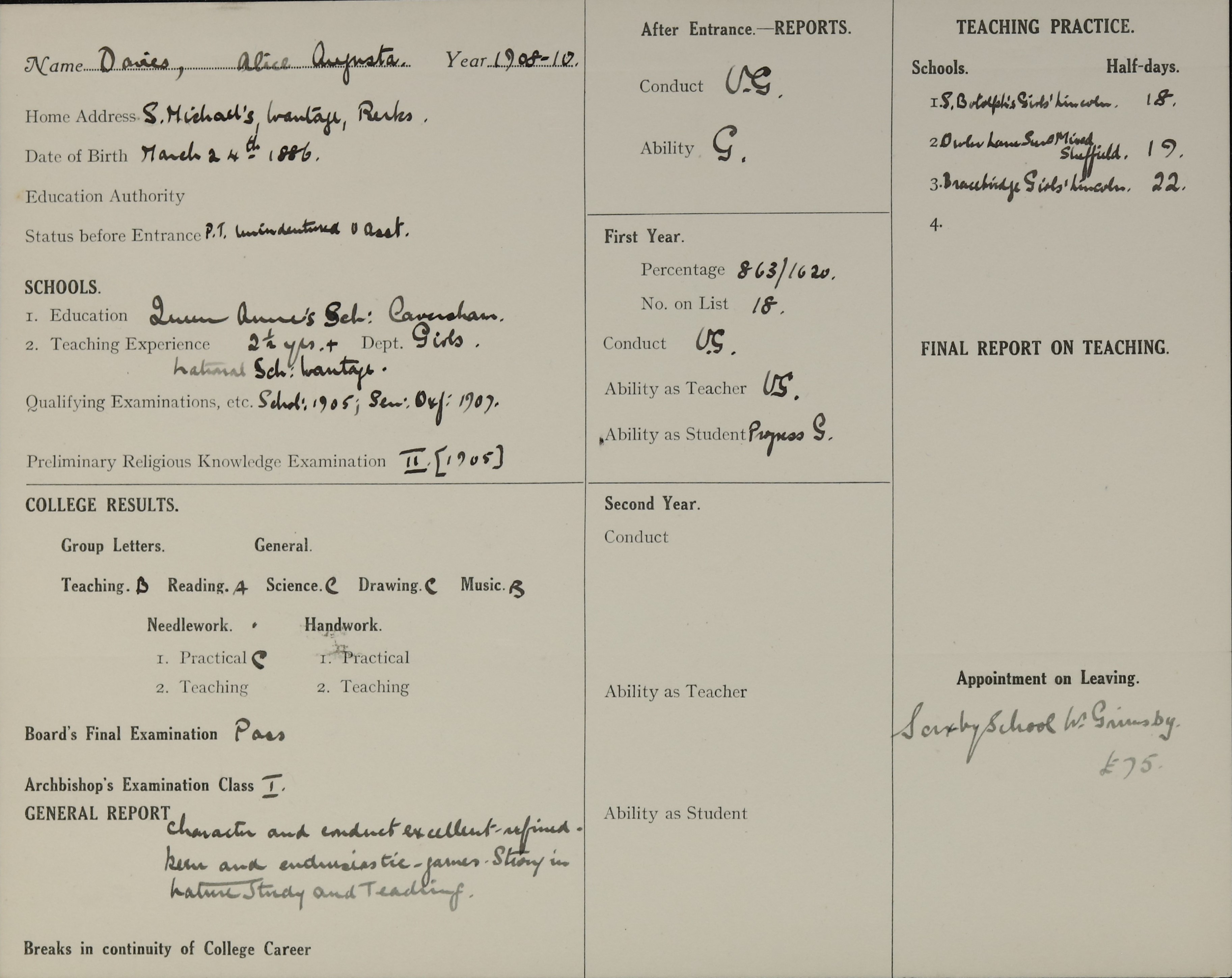 She is at Saxby, Grimsby. Alice is listed as ‘Elementary School Teacher’. Her sister, Mary, is listed as ‘Nursing’. There is a servant, Elsie Fleet (b. 1890).