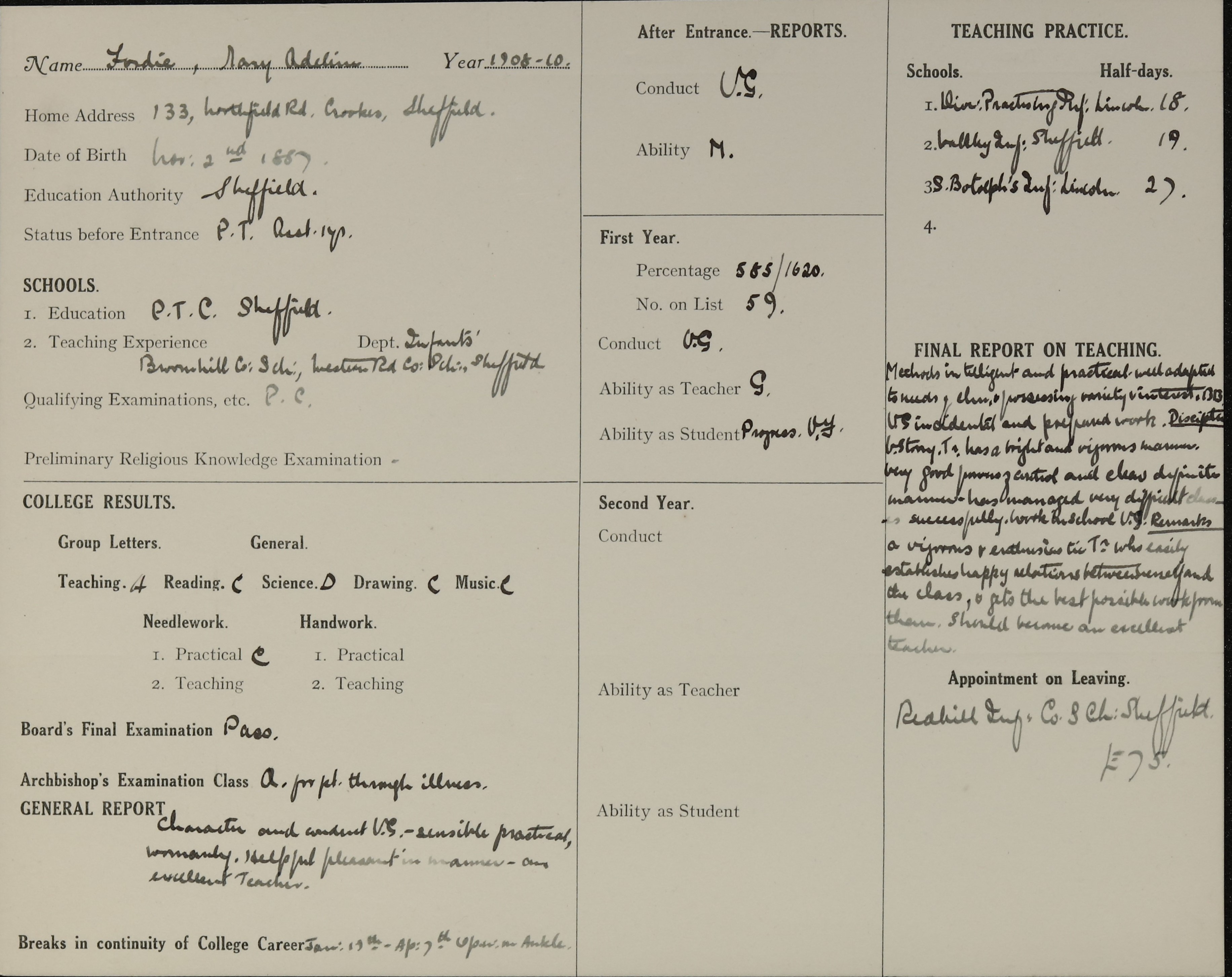 Appointed to Red Hill Infants' Council, Sheffield. £75.
