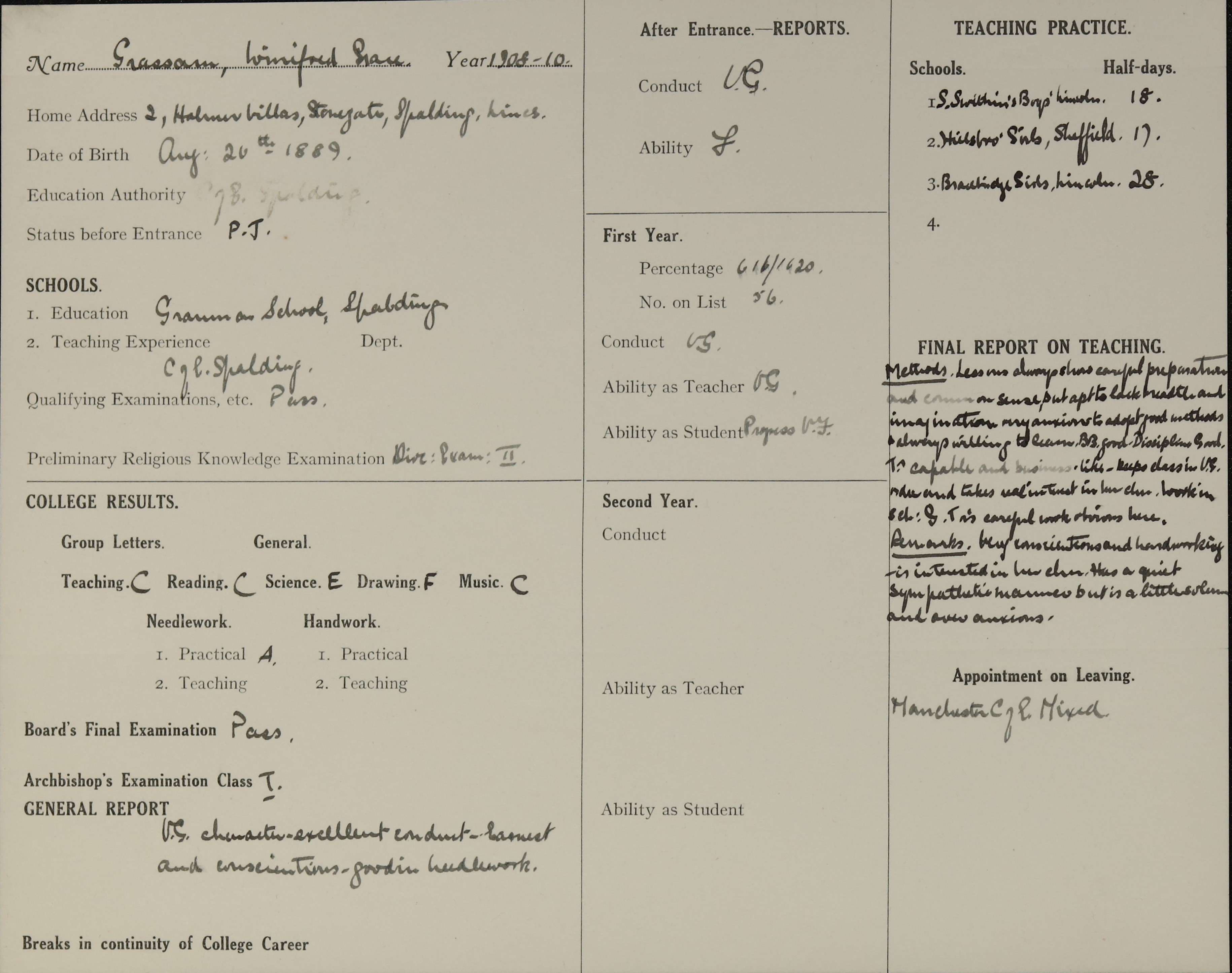 She is at High Street, Tettenhall, Wolverhampton. Her father is listed as ‘Assistant Inspector of Weights and Measures’. Her mother is listed as ‘Dressmaker’. Winifred and her sister, Olive, are unlisted. There is a servant, Harriet Williams (b. 1873).