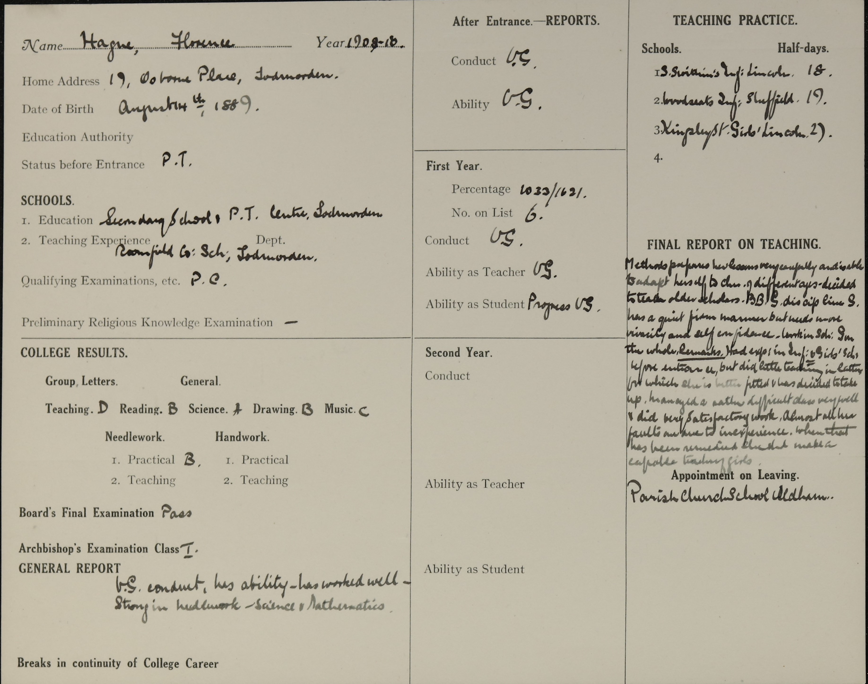 She is at 19 Osborne Place, Todmorden. Her mother is an unlisted widow. Her nephew, John William Clegg (b. 1903), is unlisted. Her brother, Ernest, is listed as ‘Calico Weaver’. Florence is listed as ‘Elementary School Teacher’.