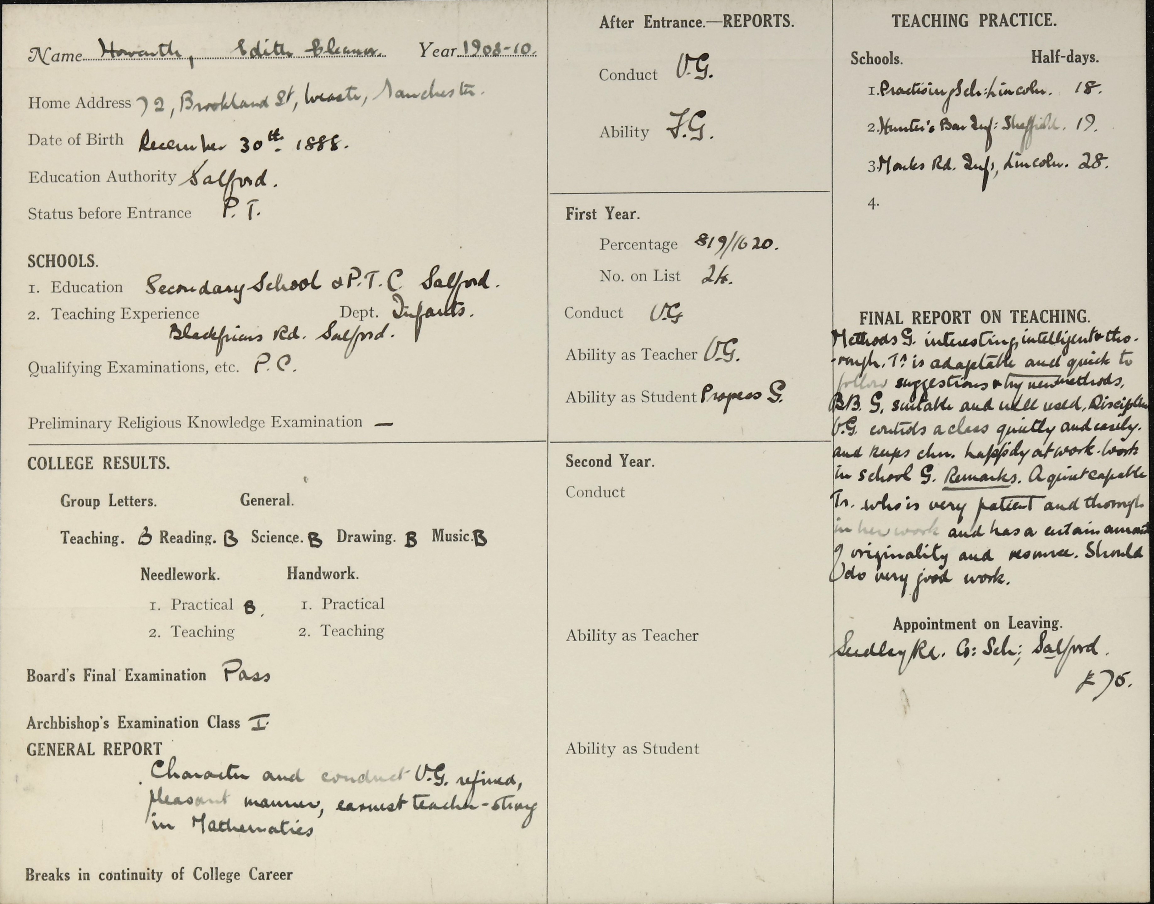 She is at 72 Brookland Street, Salford. Her mother is listed as widow and ‘House Keeper’. Her sister, Ethel, is listed as ‘Typist’. Edith is listed as ‘School Teacher’.