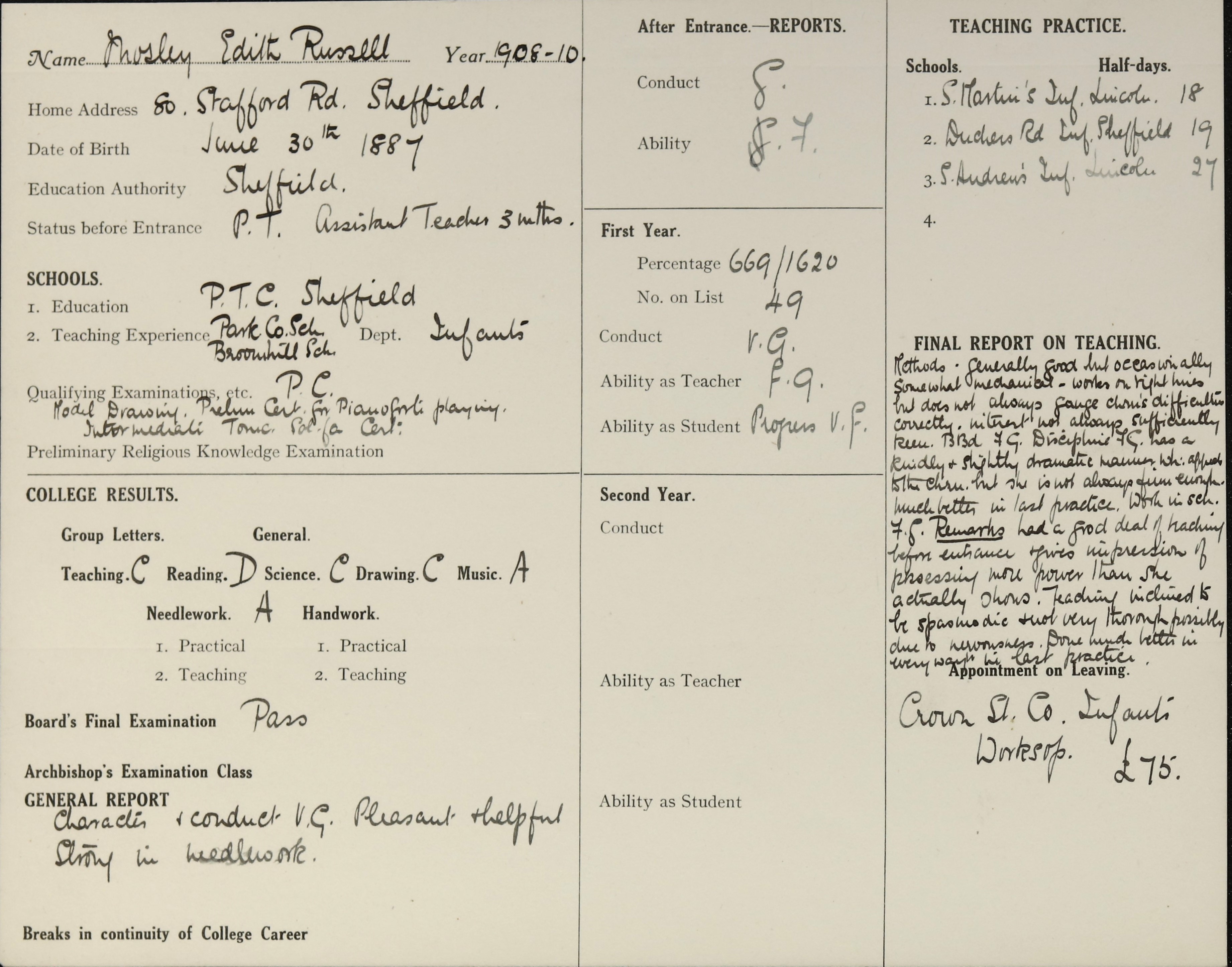 She is at 80 Stafford Road, Sheffield. Her mother, her sister, now Amelia Jacques, and her nieces, Renee Russell Jacques (b. 1914) and Audrey Mary Jacques (b. 1921), are unlisted. Edith is listed as ‘School Teacher’. Her brother-in-law, Charles Jacques (b. 1885), is listed as ‘Crane Driver’.