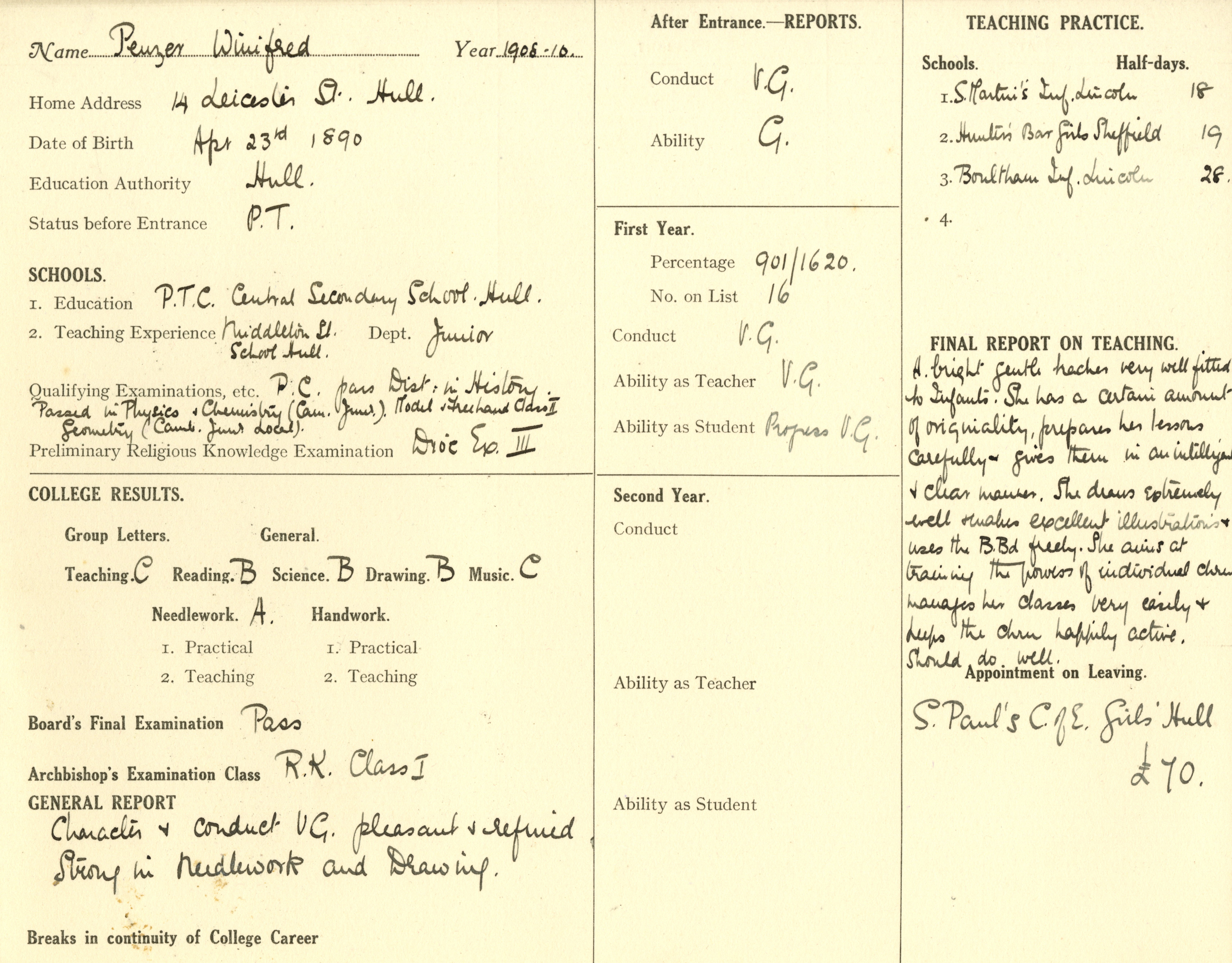 Appointed to St. Paul's C. of E. Girls', Hull. £70.