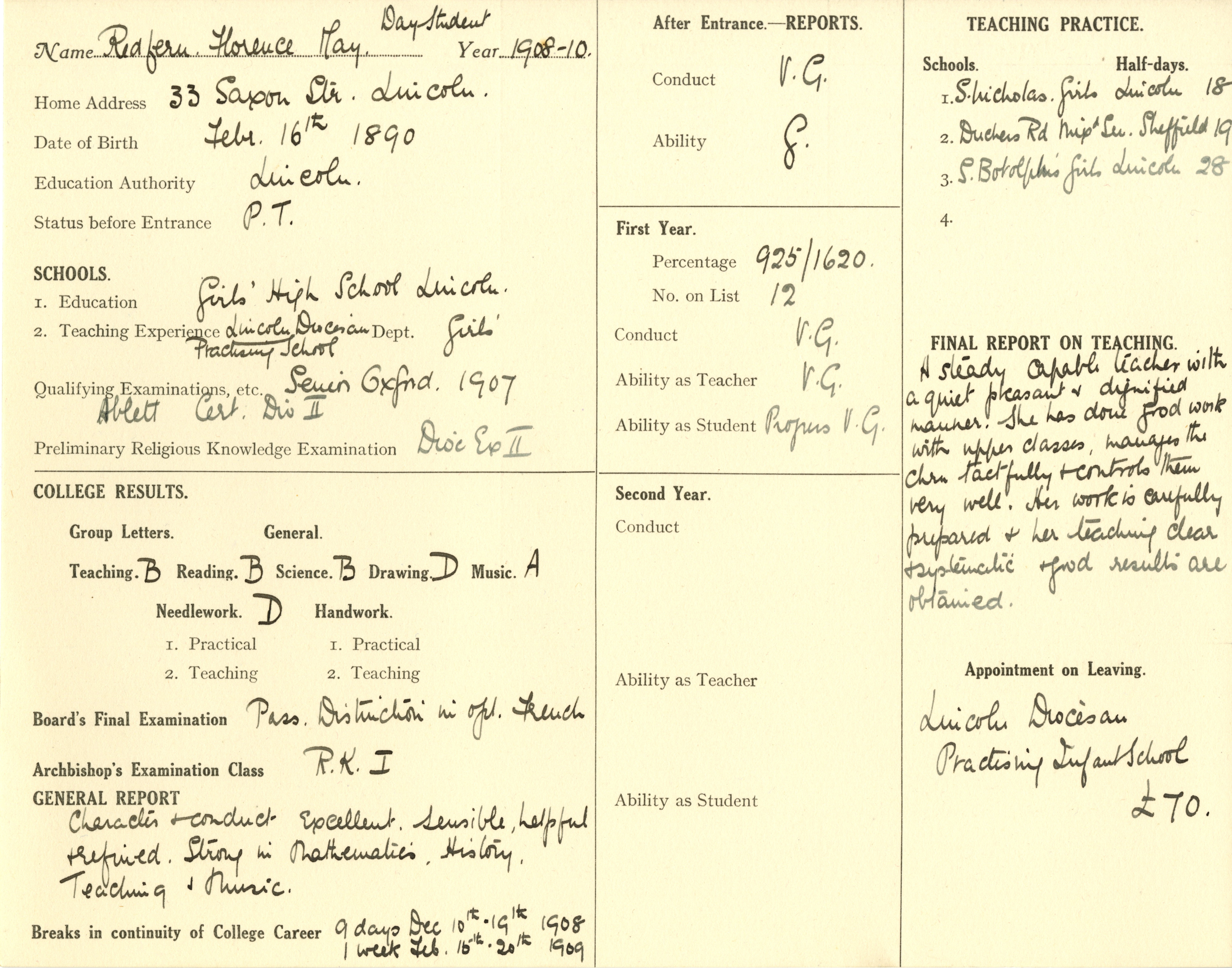 She is at 33 Saxon Street, Lincoln. Her father is listed as ‘Assistant Overseer and Collector’. Her sister, Bertha, is listed as ‘Dressmaker’. Florence is listed as ‘Elementary School Teacher’. Her mother and sister, Dorothy, are unlisted.