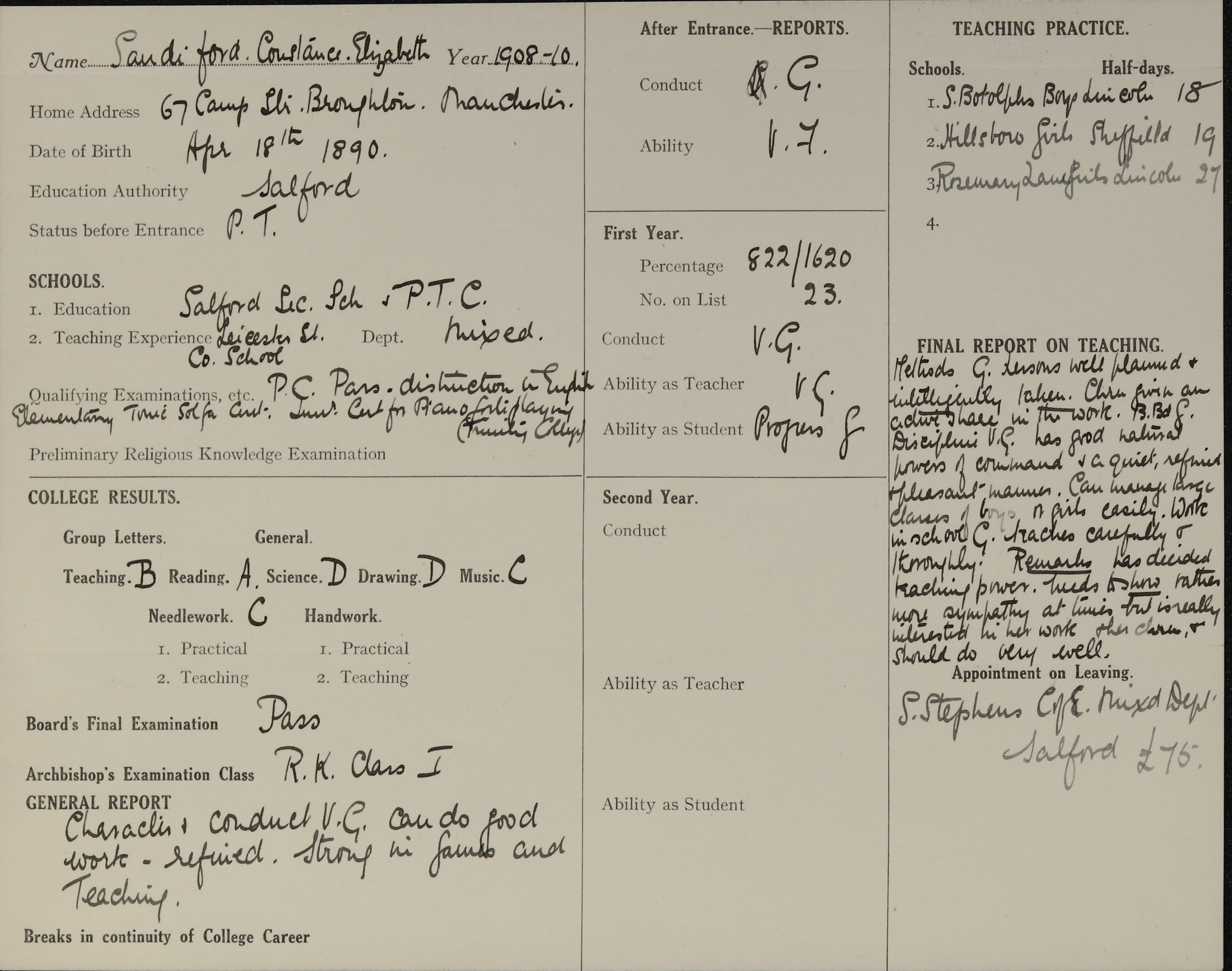 She is at Croft Street, Broughton, Salford. Her father is listed as ‘Certificated Teacher of Public School’. Constance, her mother and sister, Ethel, are unlisted.