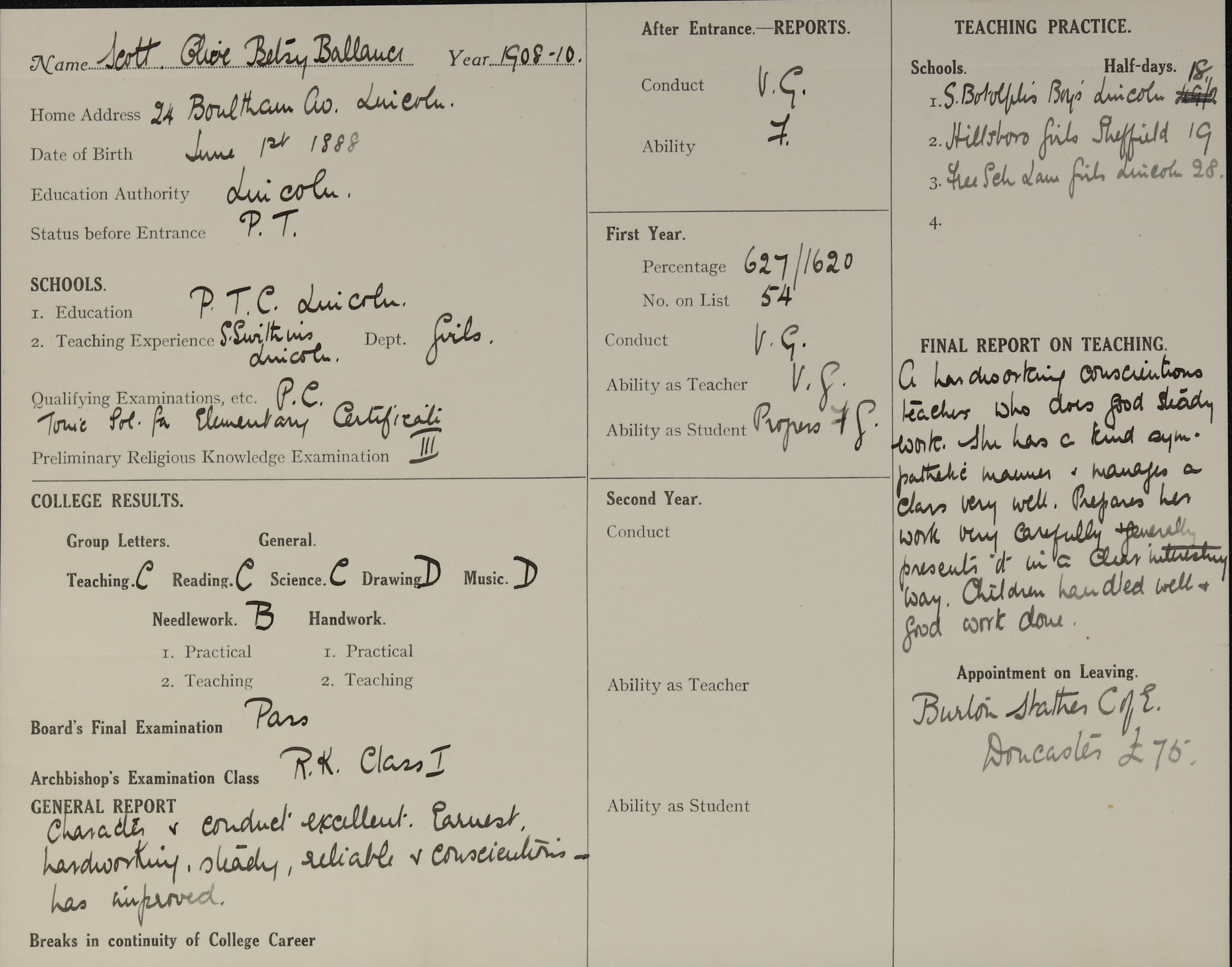 She is at Marton, Gainsborough. Her grandfather, John Scott (b. 1829), is listed as ‘Shoemaker’. Her father is listed as ‘Butler Domestic Servant’. Olive, her mother and grandmother, Rachel Scott (b. 1868), are unlisted.