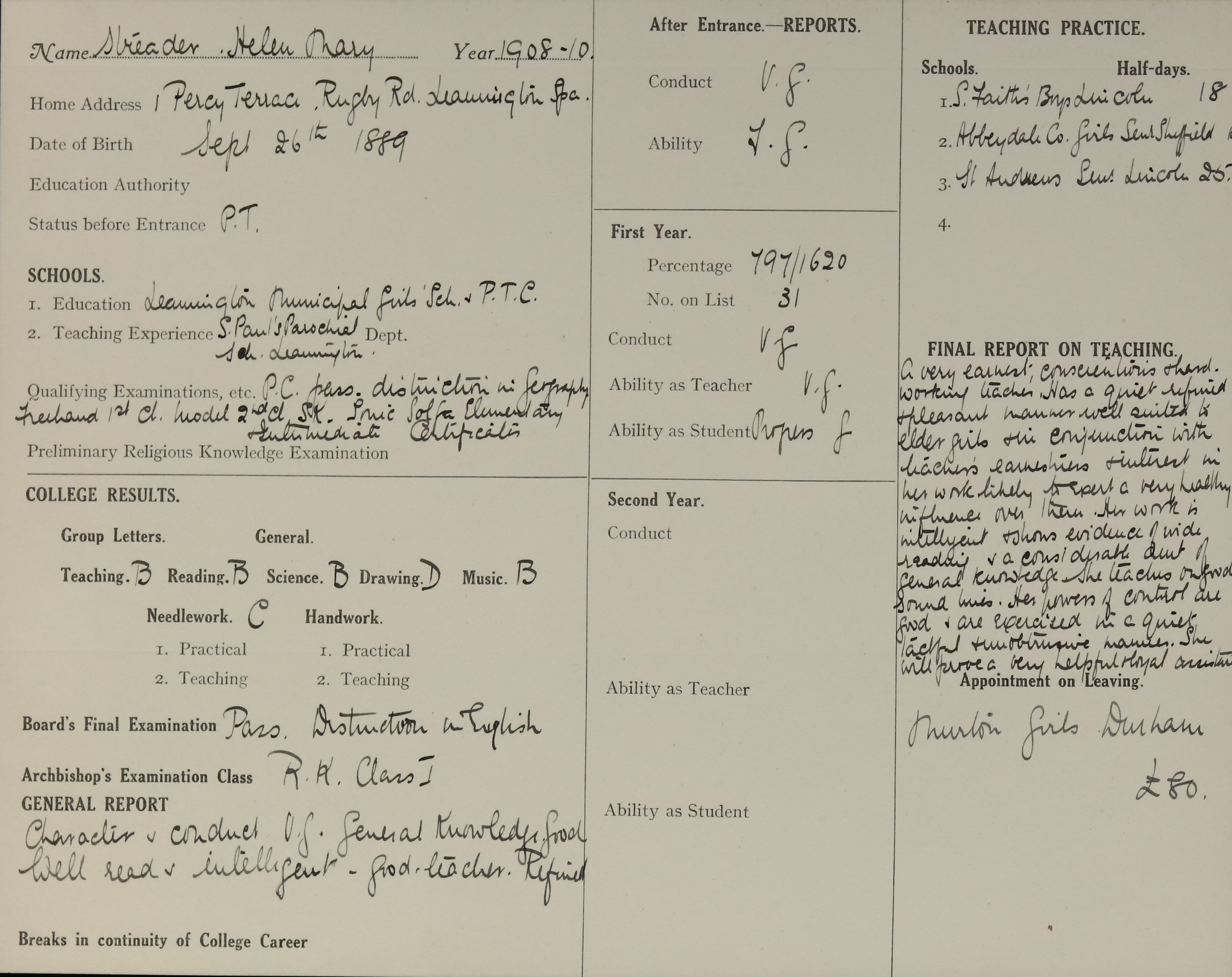 Appointed to Murton Girls', Durham. £80.