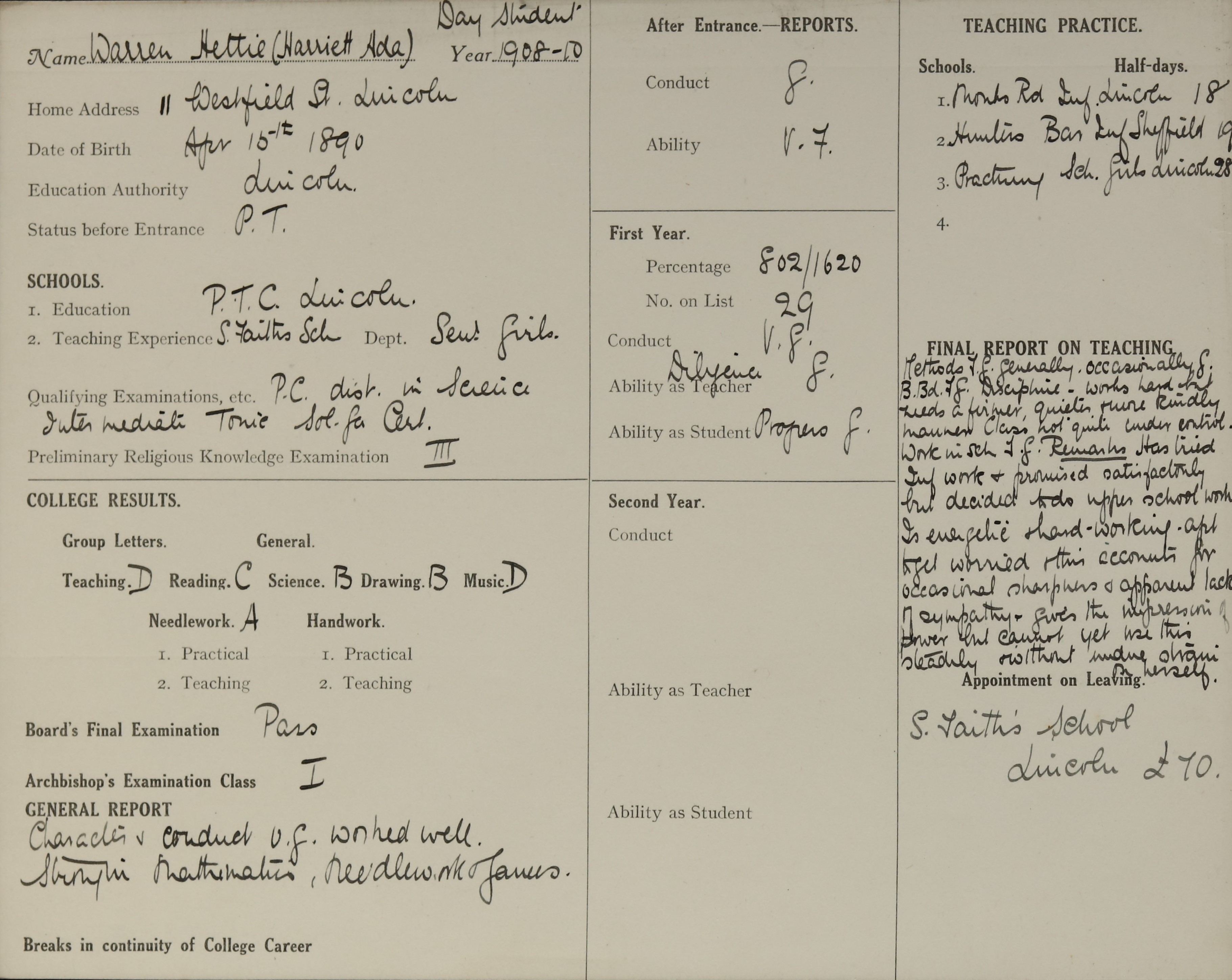 Appointed to St. Faith's Infants', Lincoln. £70.