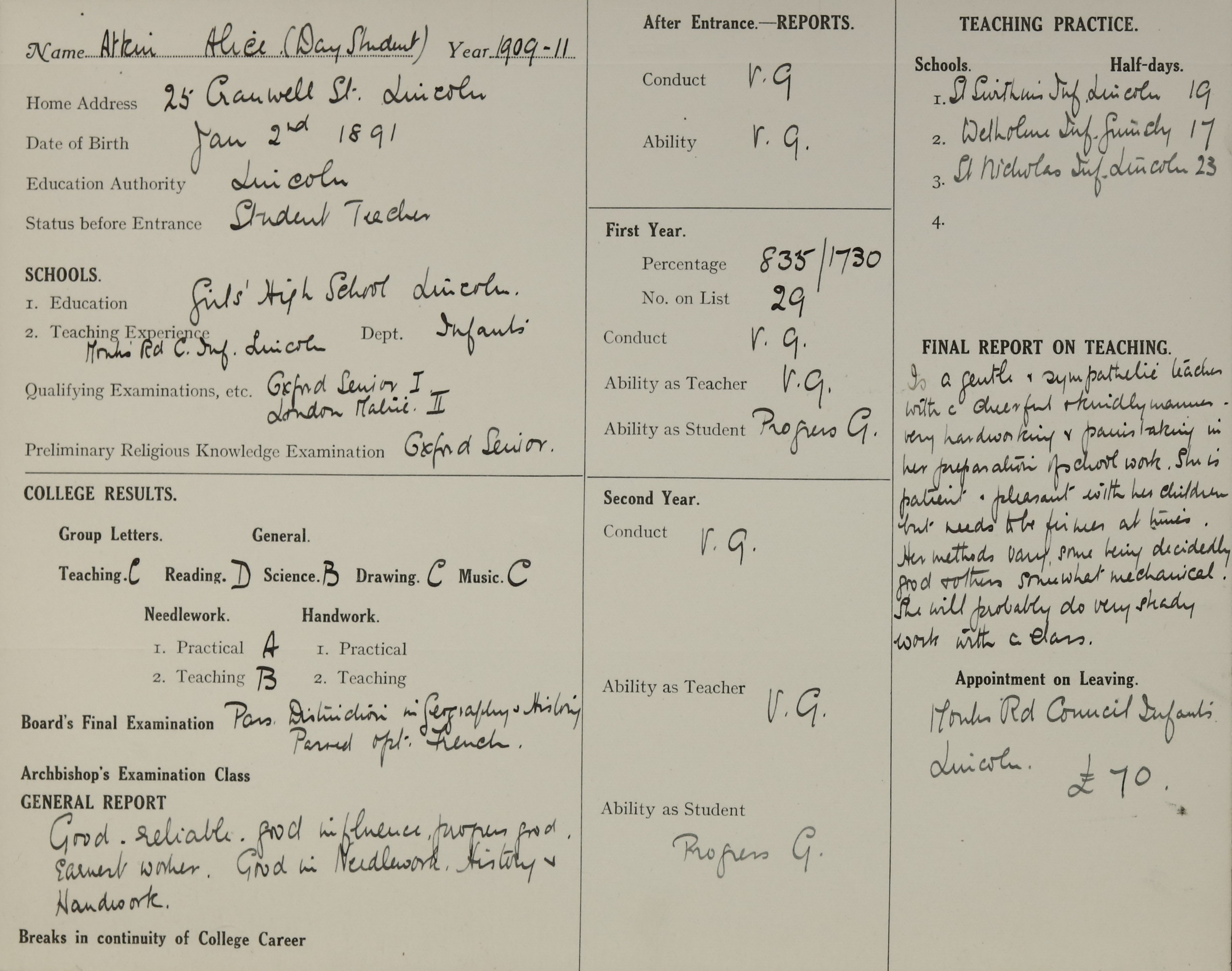 She is at 66 Doddington Road, Lincoln, Her father is listed as widowed and ‘Coal Merchant Retired’. Alice is listed as ‘School Teacher’.