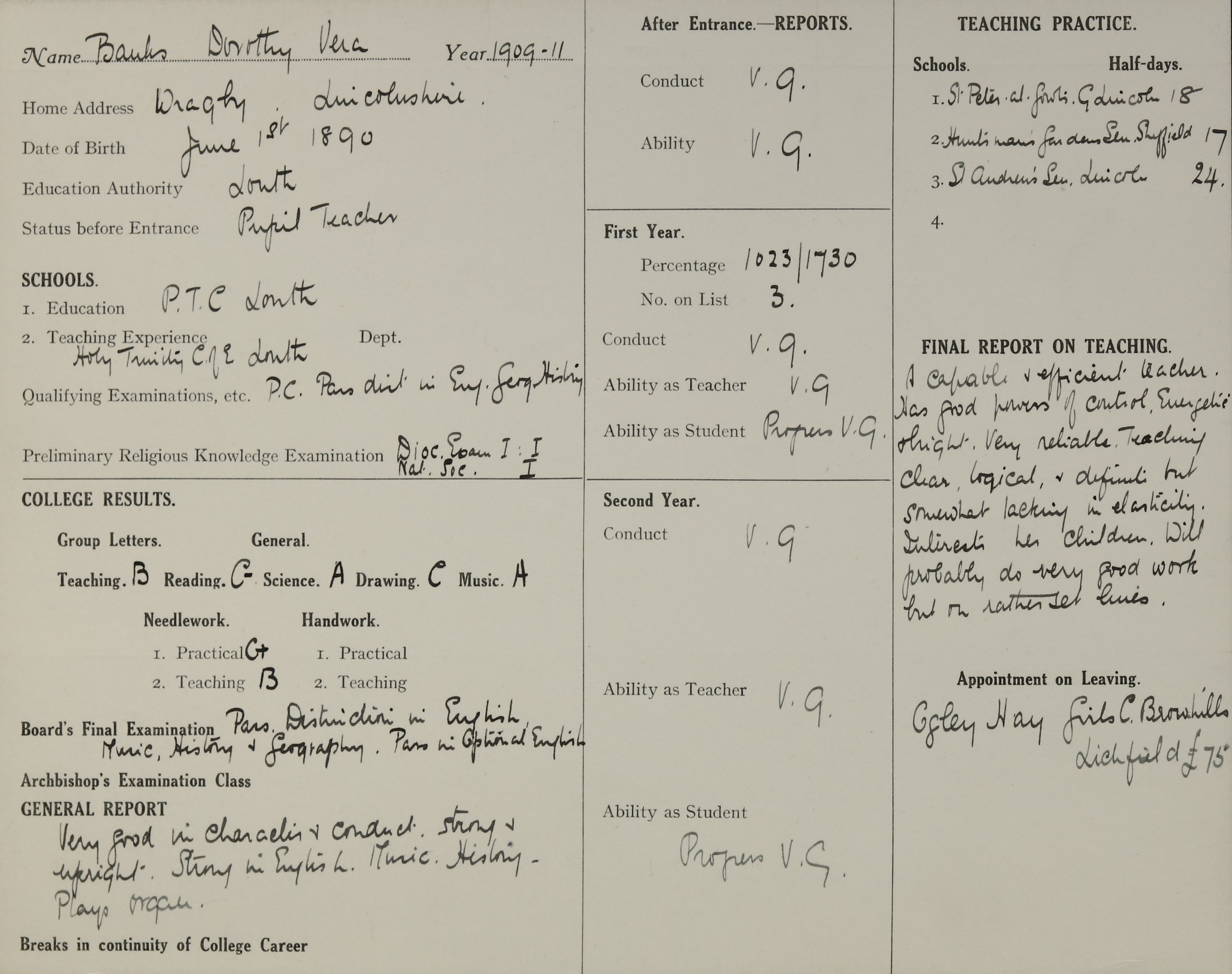 She is at 13 Haffenden Road Lincoln. Her mother is an unlisted widow. Dorothy is listed as ‘School Teacher’.