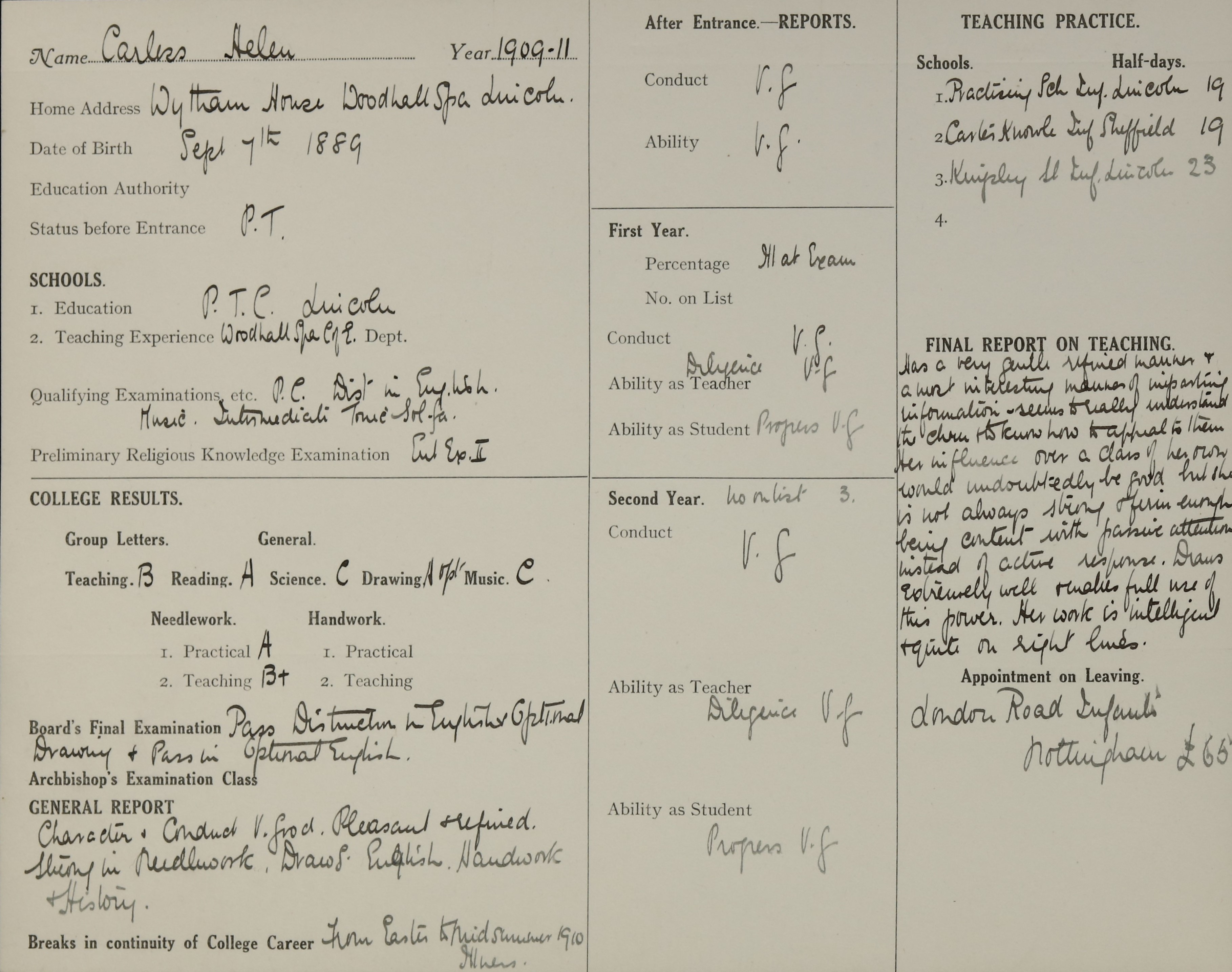 She is at William Road, Woodhall Spa. Her father is listed as ‘Livery Stable Keeper’. Helen and her sisters (Marjorie and Muriel) are unlisted. Sarah J Bishop (b. 1849) is listed as ‘Mother’s Help’. There is a servant, Alice Massey (b. 1886).
