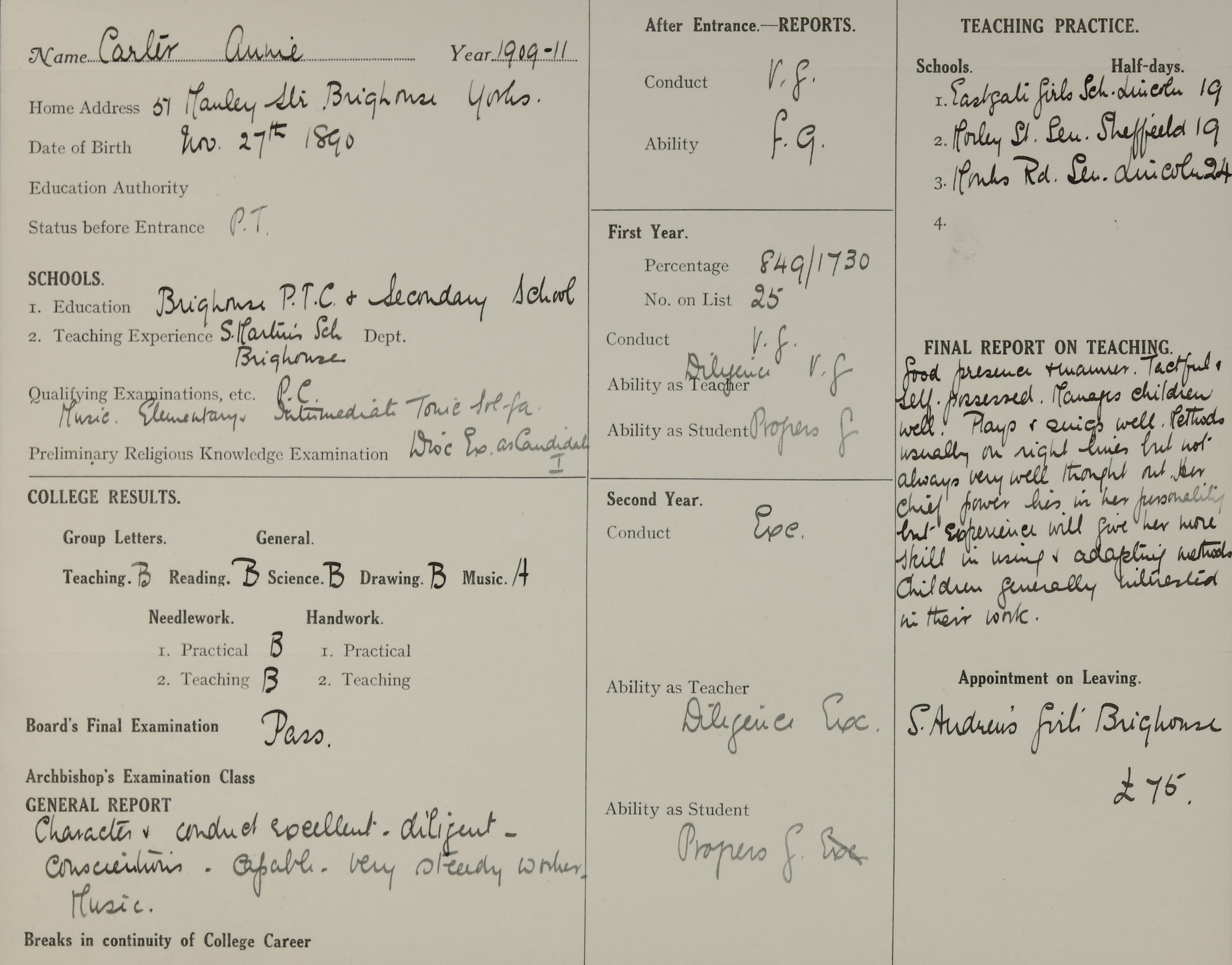 Appointed to St. Andrew's Girls', Brighouse. £75.