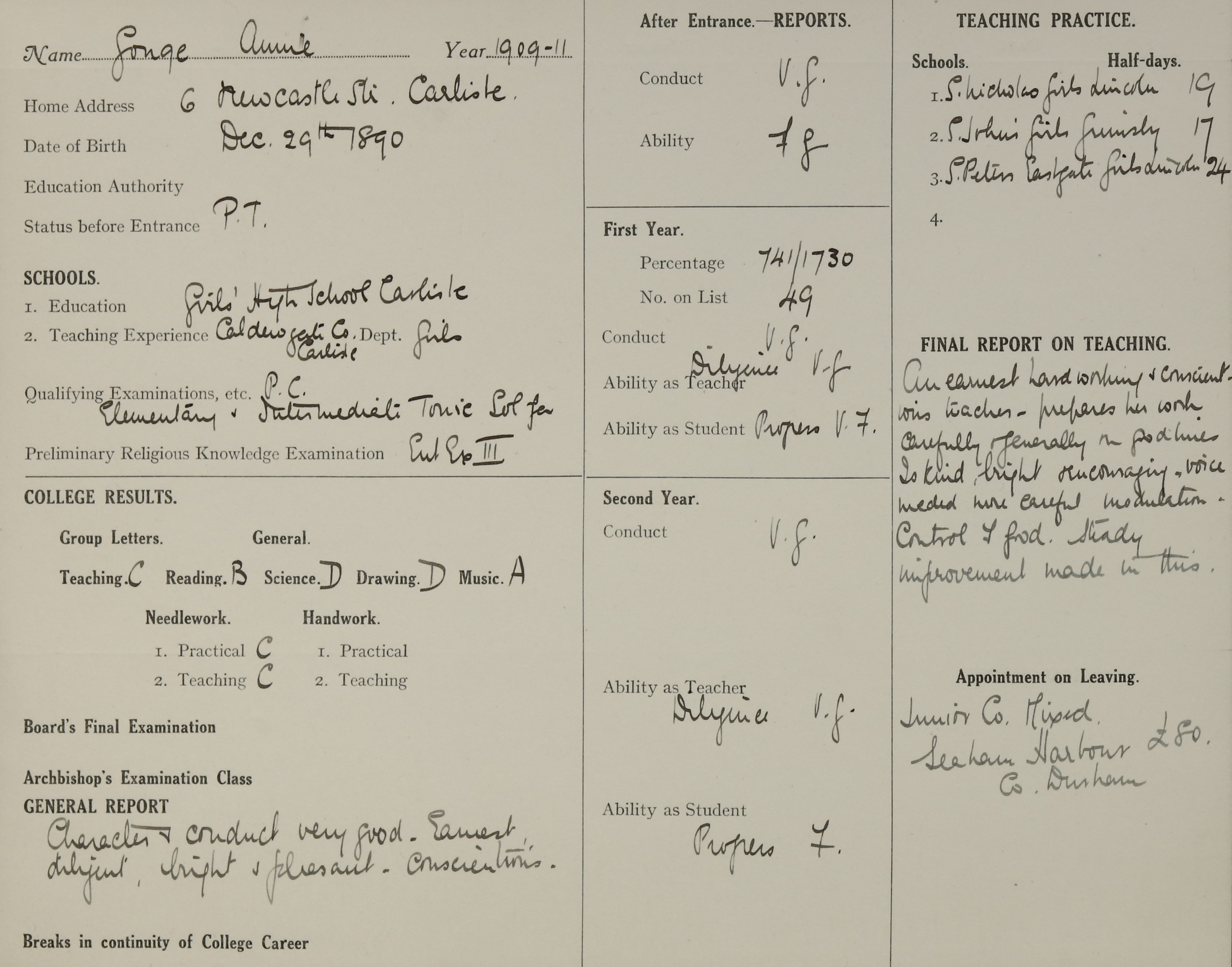 Appointed to Junior Council Mixed, Seaham Harbour, Co. Durham. Assistant.