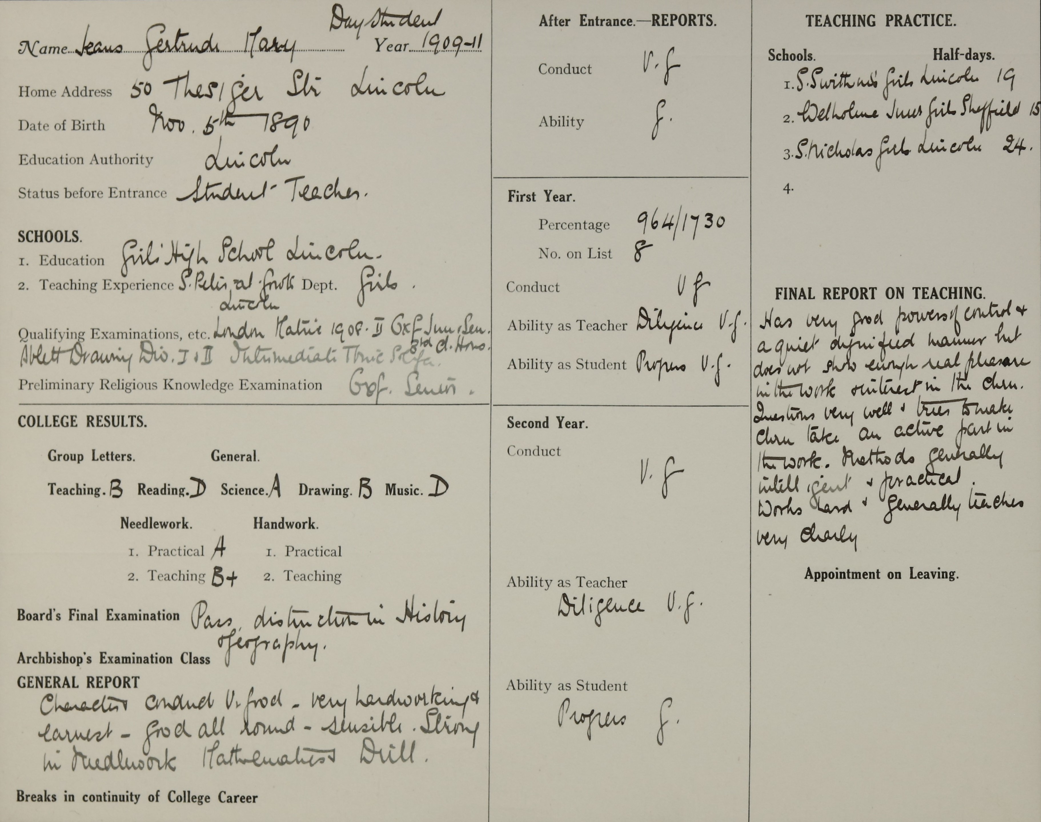She is at 447 High Street, Lincoln. Her father is listed as ‘Railways Crossing Keeper’. Her mother is unlisted. Gertrude is listed as ‘Elementary School Teacher’.