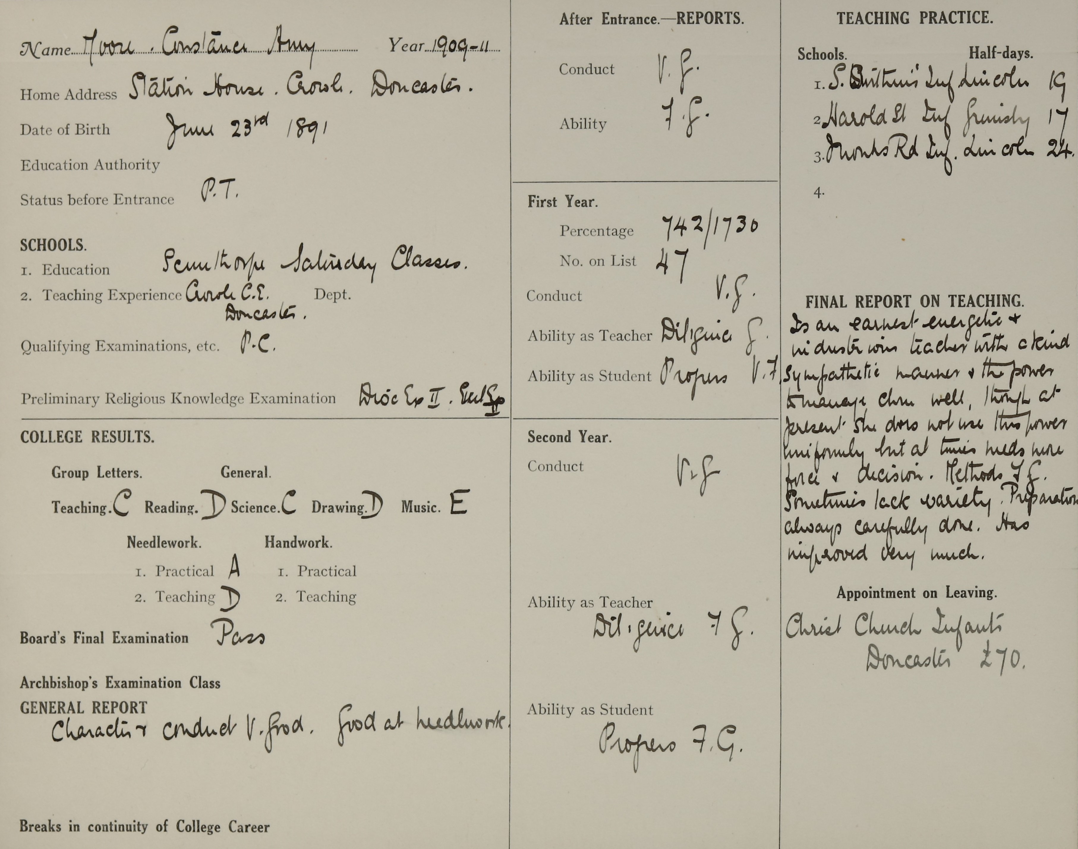 She is at Station House, Crowle. Her father is listed as ‘Railway Station Master’. Her mother is unlisted. Constance is listed as ‘School Teacher’. Her brother, Charles, is listed as ‘Goods Clerk’. Her brother, Alexander, is listed as ‘Steel Works Analyst’.