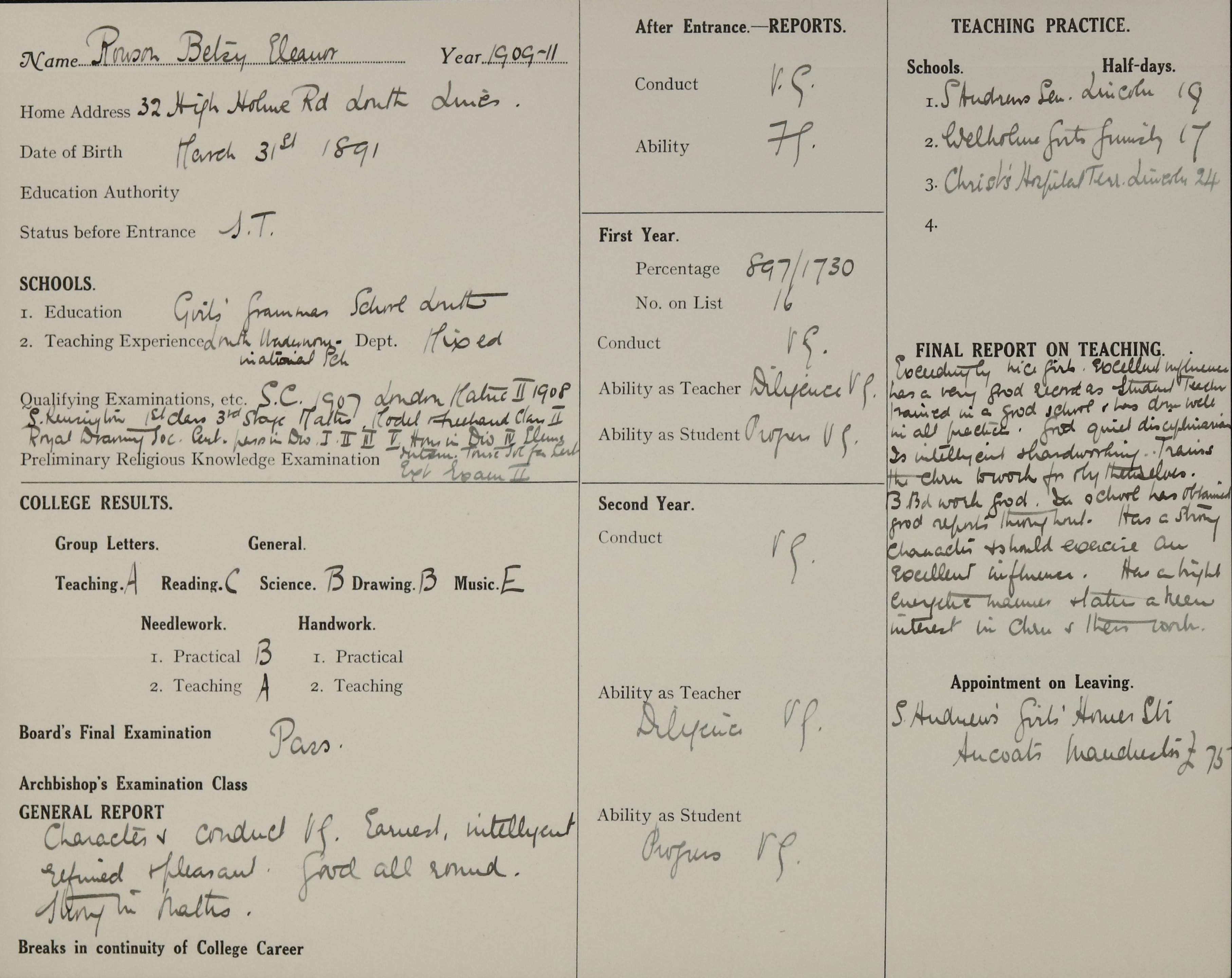 Appointed to St. Andrew's Girls', Homer St., Ancoats, Manchester. £75.
