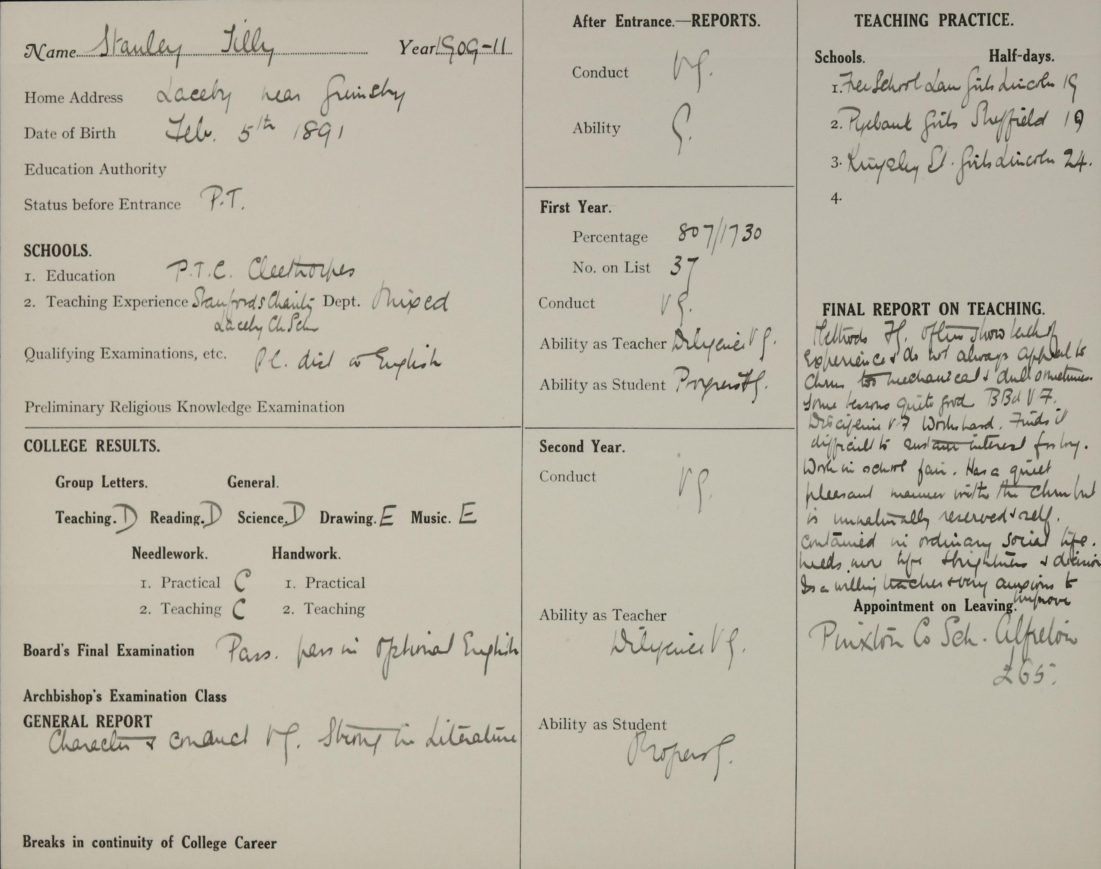 Appointed to Teaching Temporarily at Laceby, Grimsby.