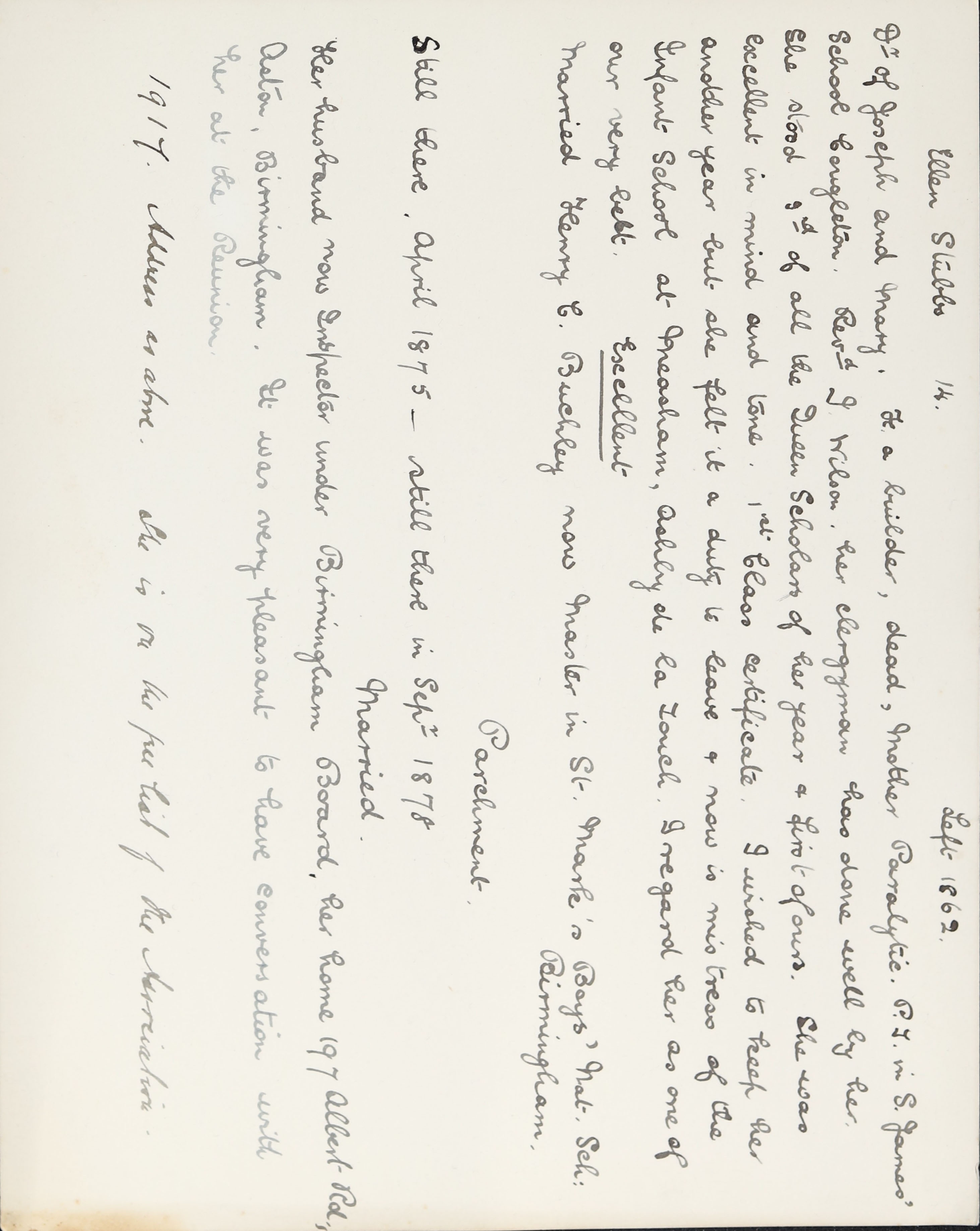 She is at 197 Albert Road, Aston Manor. Her husband is listed as ‘Inspector of Schools Aston Moor Retired’. Ellen, her daughter, Ellen and her niece, Frances Mary Florence Jane Stubbs (b. 1871) are unlisted. Her niece, Alice Mary Stubbs (b. 1873), is listed as ‘Canteen Worker NWCA Kent’.