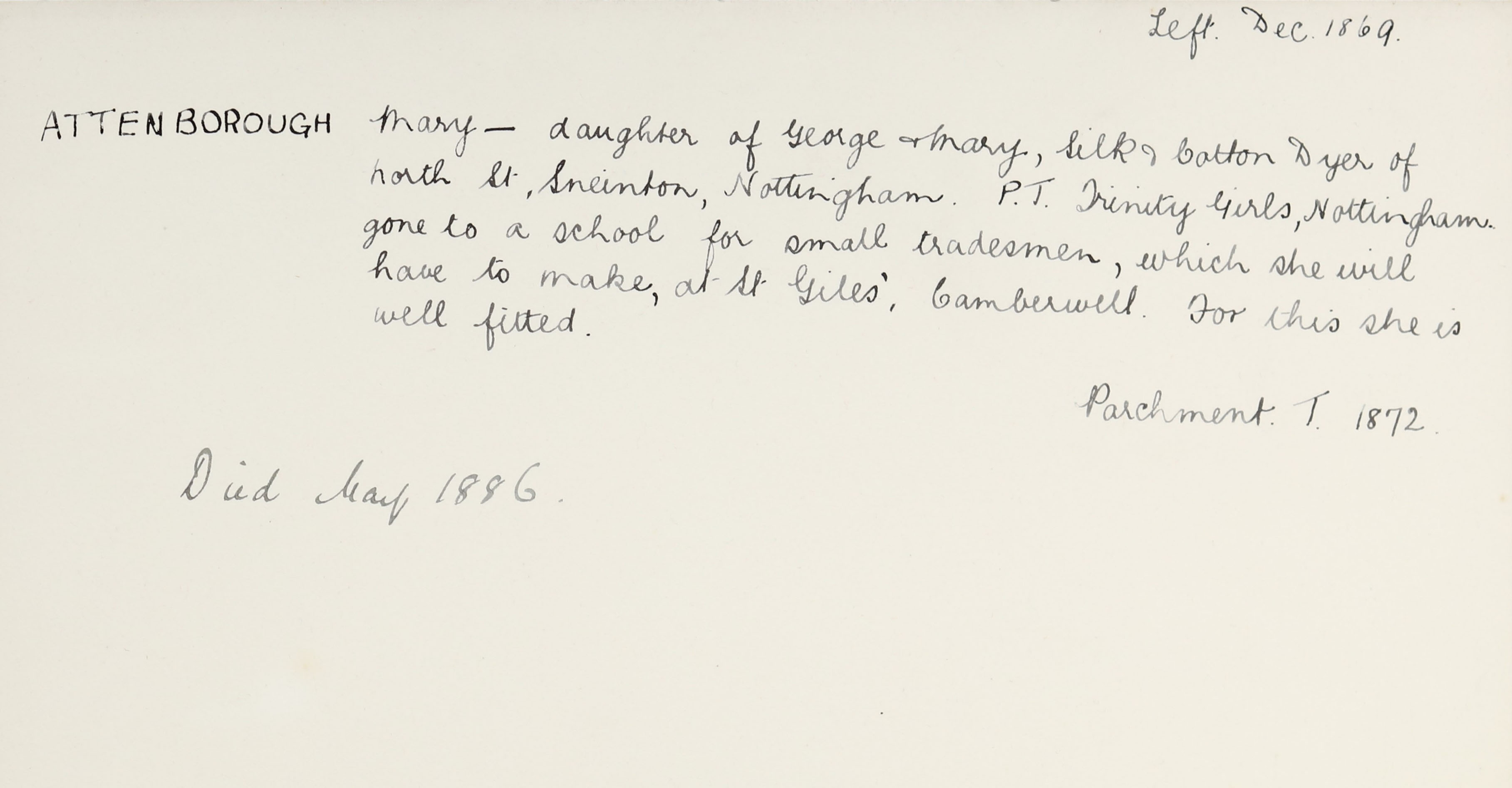 She is at Carlton Road, Snenton, Nottingham. Her father is listed as ‘Master Dyer Employing 82 Men & 3 boys’. Mary, her mother, and her siblings, George and Clara, are unlisted. There are two boarders: Sarah Tucker (b. 1797) is listed as ‘Tambourer’ and Elizabeth Tucker (b. 1827) is listed as ‘Milliner’. There is also a servant, Martha Smith (b. 1848).