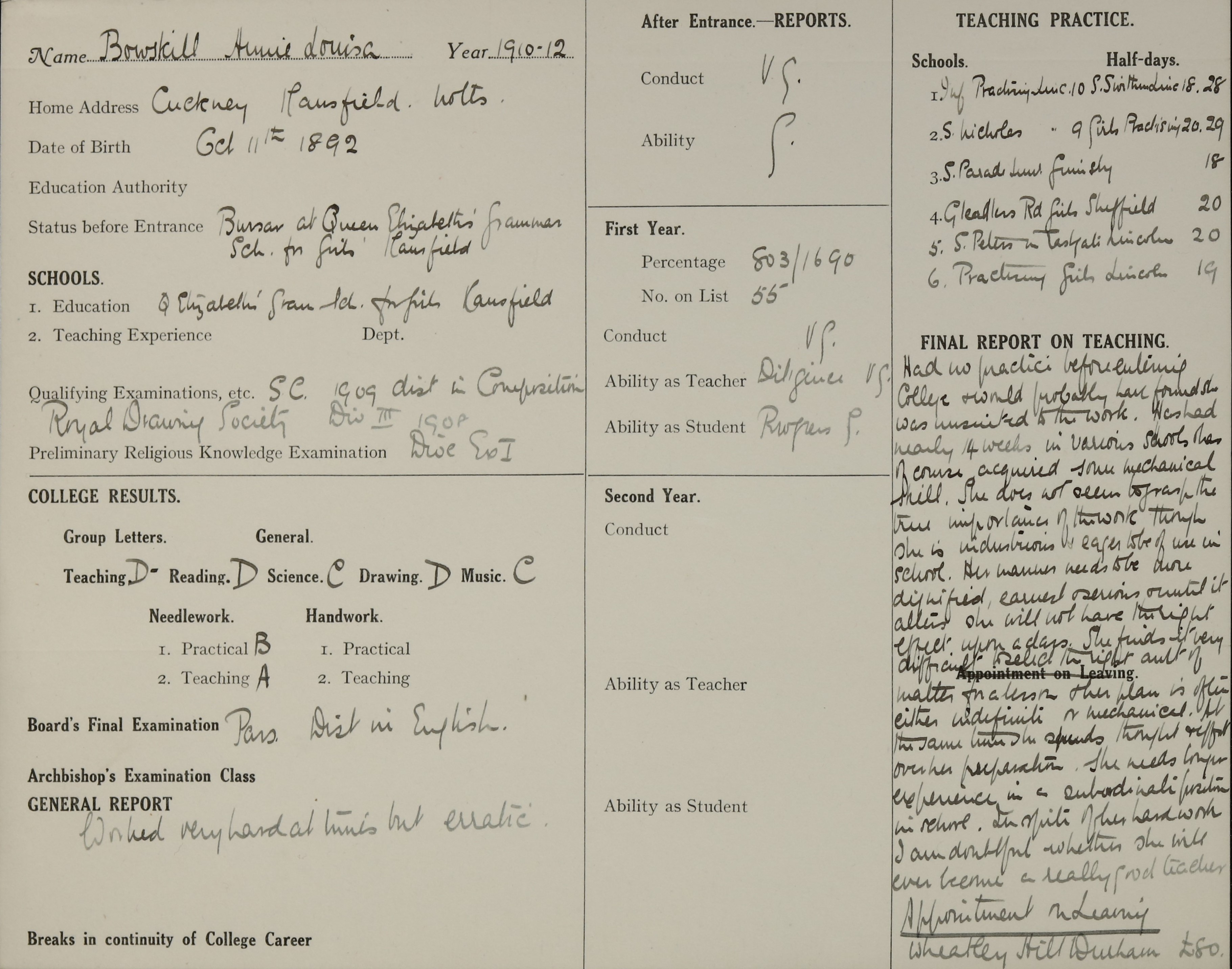She is at The Cottages, Cuckney, Worksop. Her father is listed as ‘Joiner Foreman Retired’. Annie is listed as ‘Teacher Elementary’.