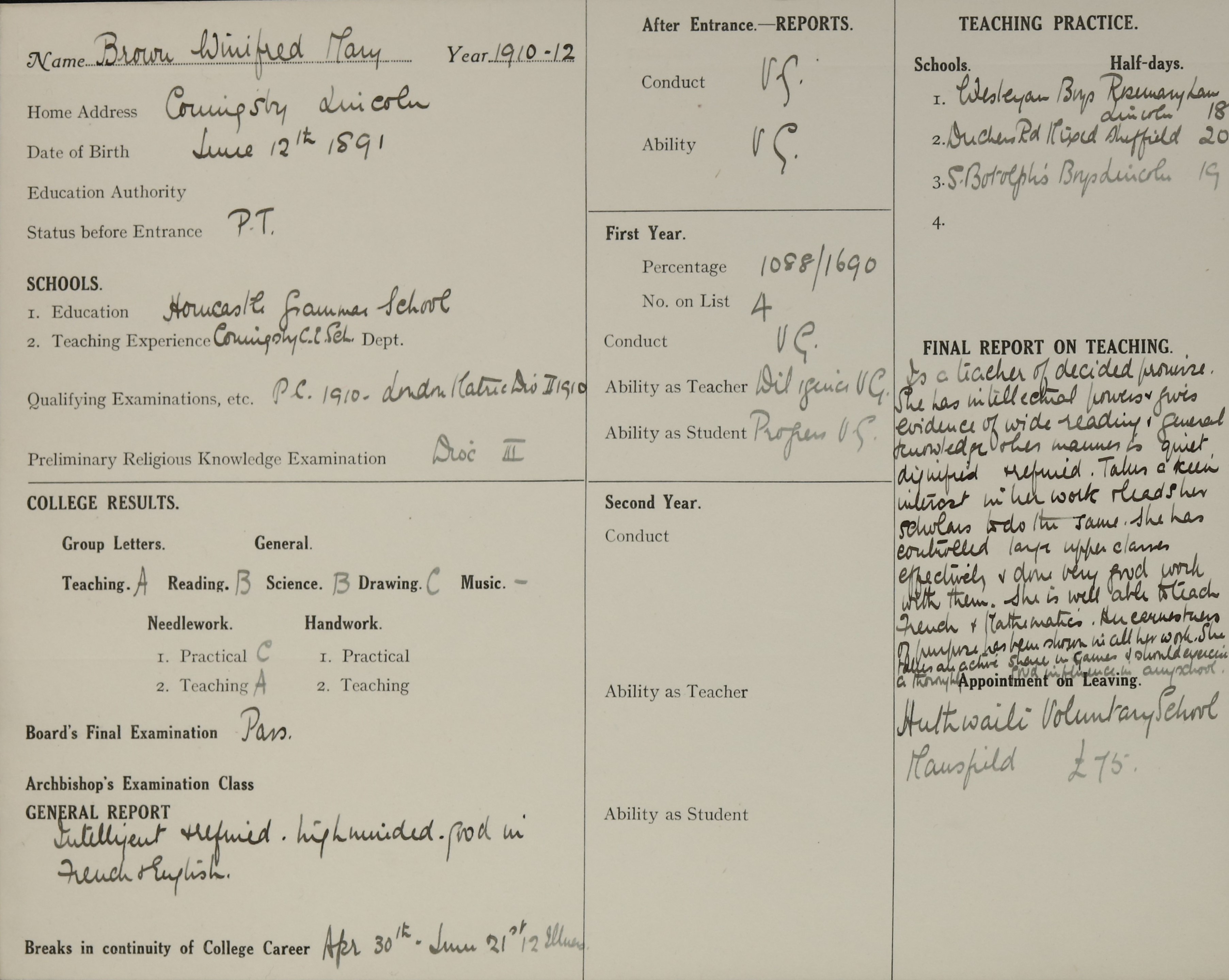 Qualification: P.C., 1910, Sen. Camb. Matric. 1910 II.