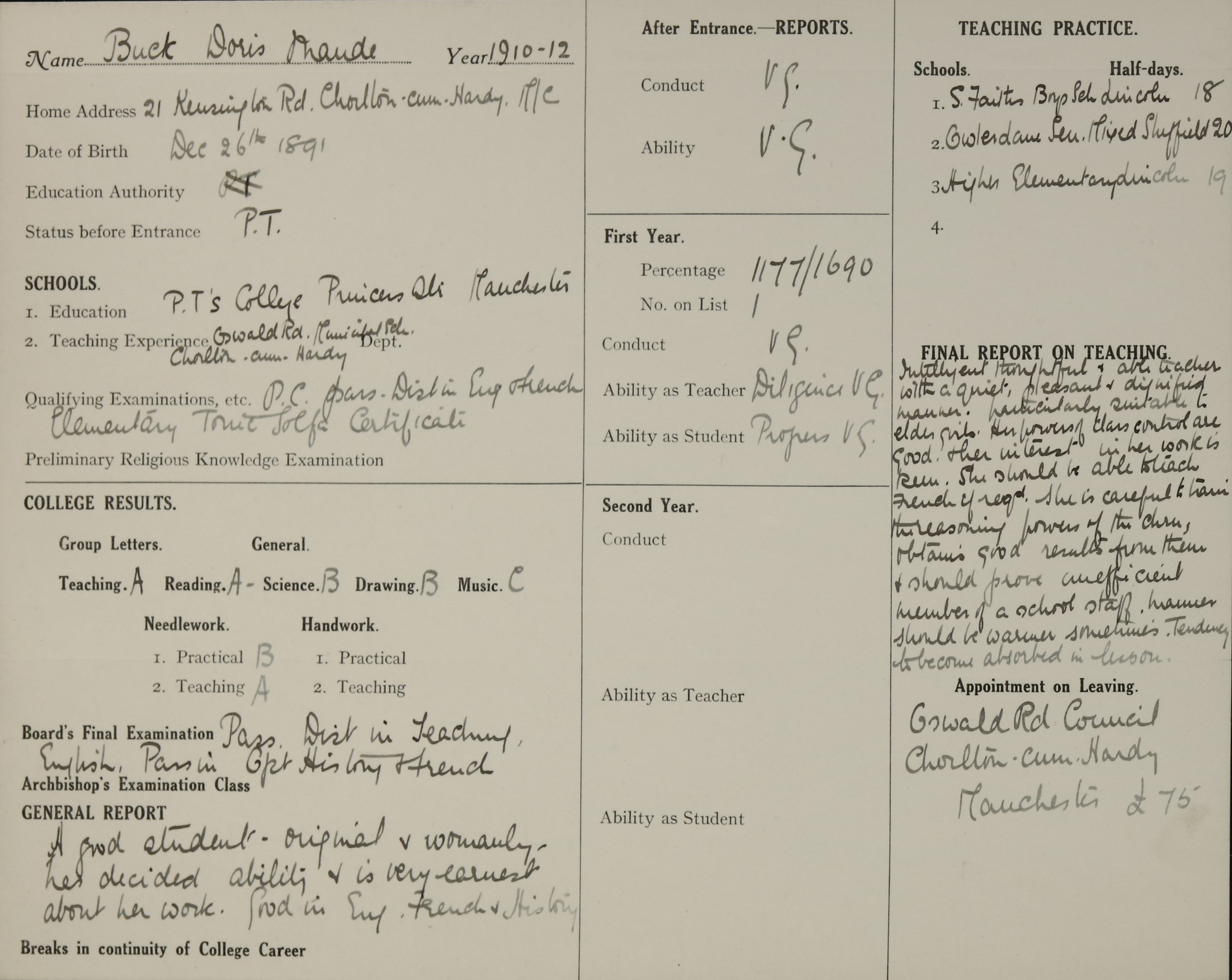 She is at 21 Glen Eldon Road, St Anne’s on the Sea. Her father is listed as ‘Oil Merchants Book Keeper’. Doris, her mother, her sister, Mavis, and her cousin, Tom Actterill (b. 1898), are unlisted. Her great aunt, Eliza Buck (b. 1829), is listed as ‘Living on Own Means’. There is a servant, Sarah Ann Iddeson (b. 1878). There is a visitor, Ellen Holme (b. 1834), listed as ‘Living on Own Means’.