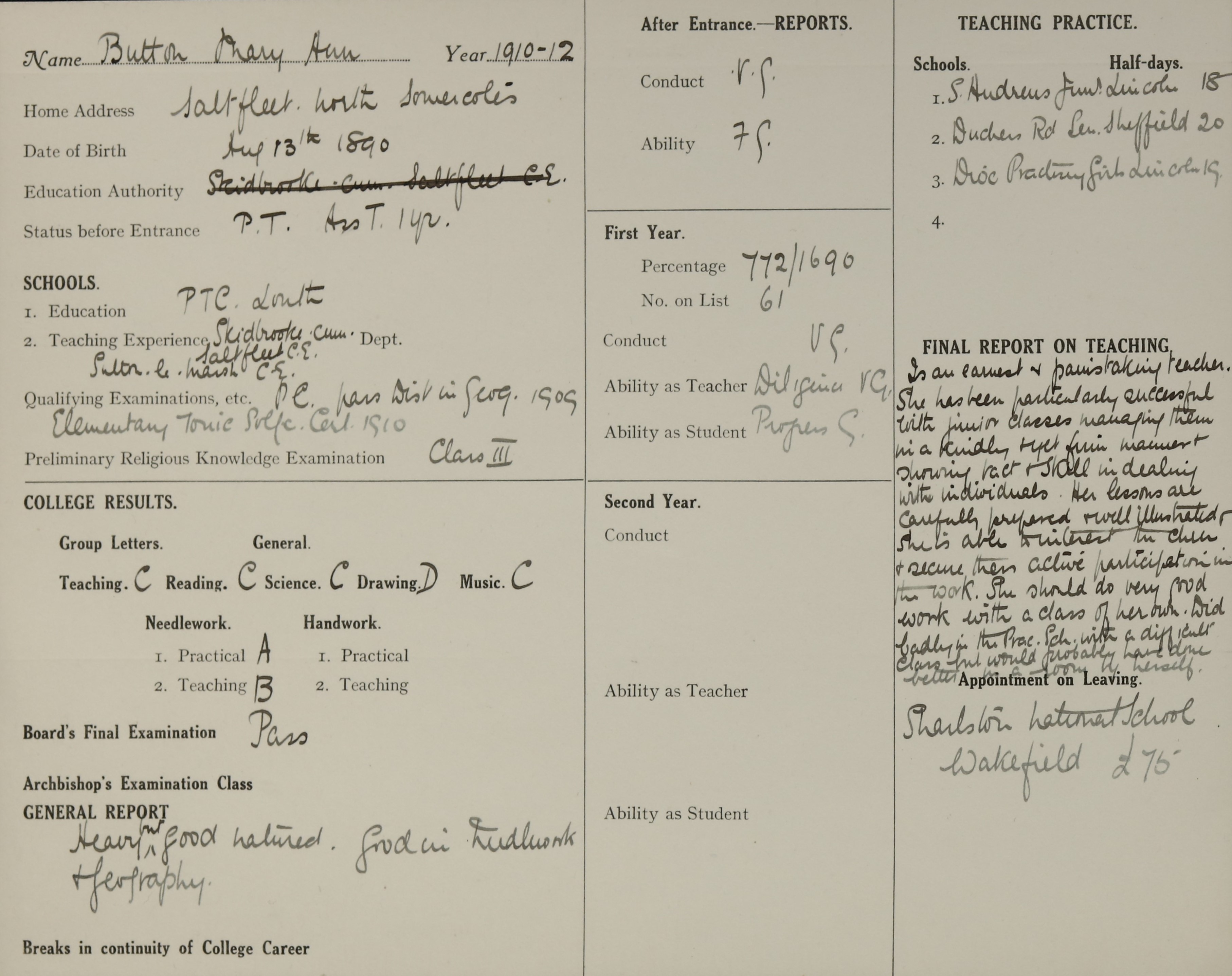 Appointed to Sharlston National School, Wakefield. £75.