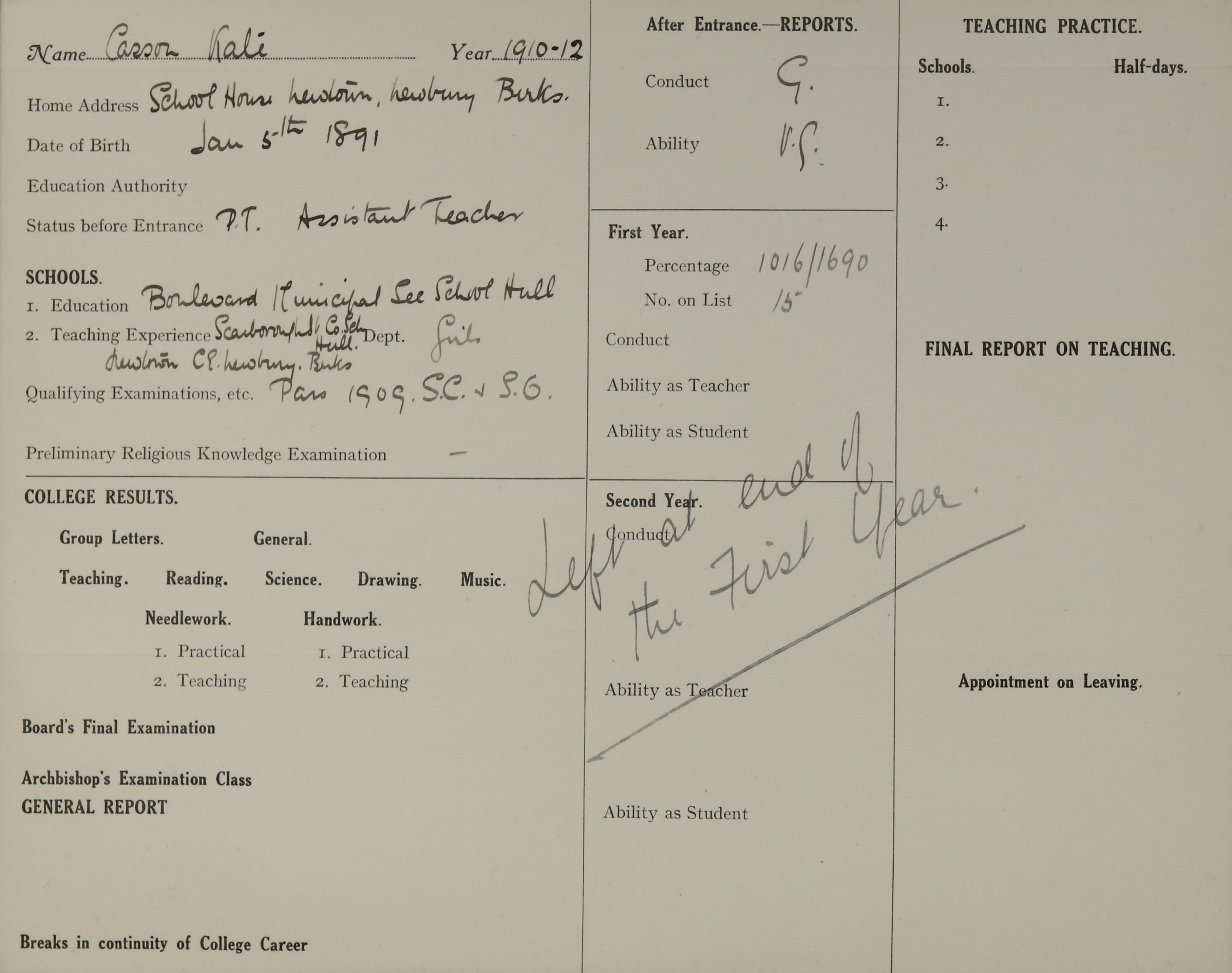 PT at Scarboro' St. Co. Girls', Hull.