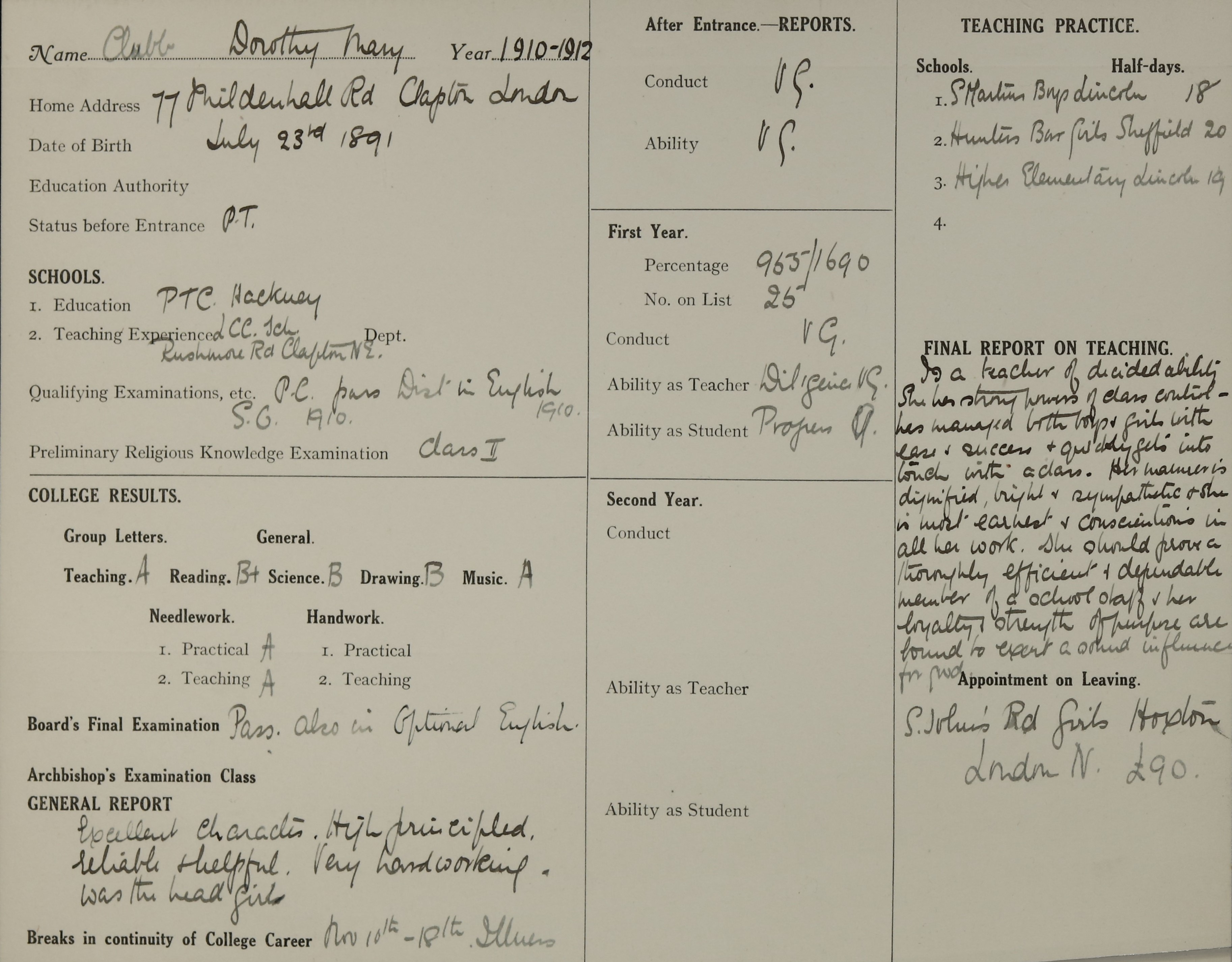 Appointed to L.C.C. St. John's Road, Girls', Hoxton, London N. £90.