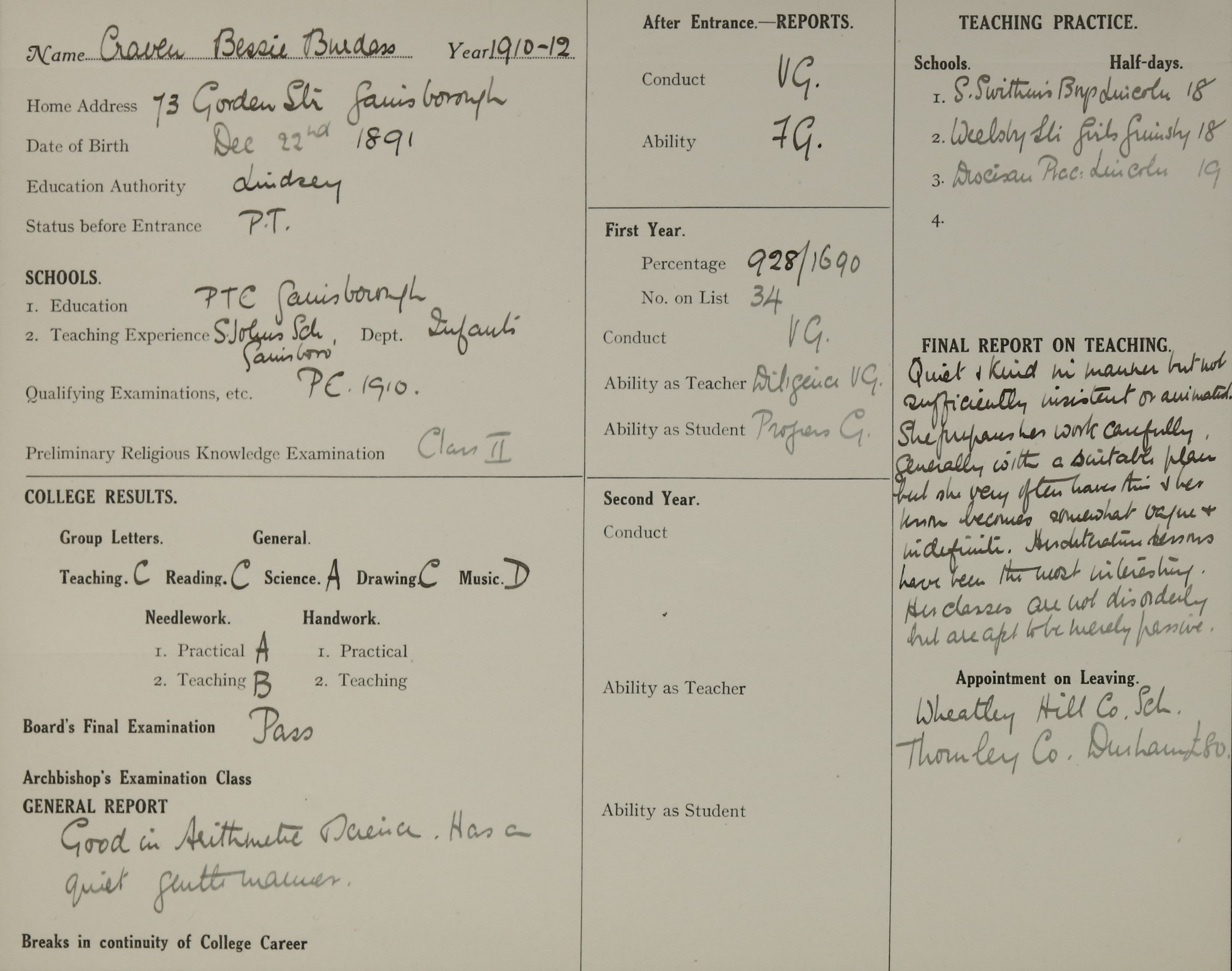 Appointed to Wheatley Hill Council School, Thornley, Co. Durham. £80.