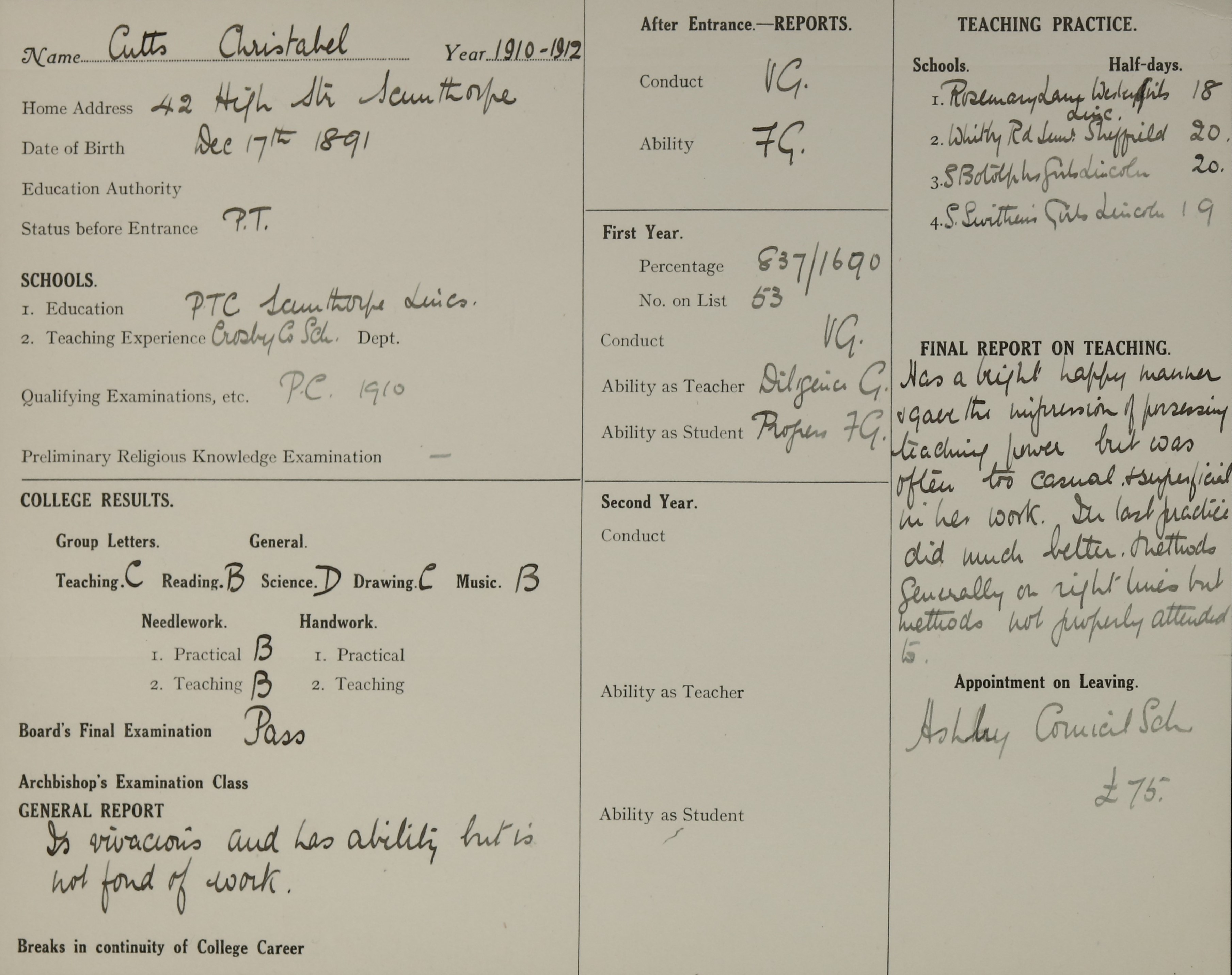 She is at 42 High Street, Scunthorpe. Her father is listed as ‘Tailor and Outfitter’. Her brother, Alfred, is listed as ‘Telegraph Clerk’. Christabel, her mother and her siblings (Stanley and Edna) are unlisted. There is a servant, Annie Holden (b. 1877). There is a visitor, Frederick J Eastbourn (b. 1882), listed as ‘Clerk’.